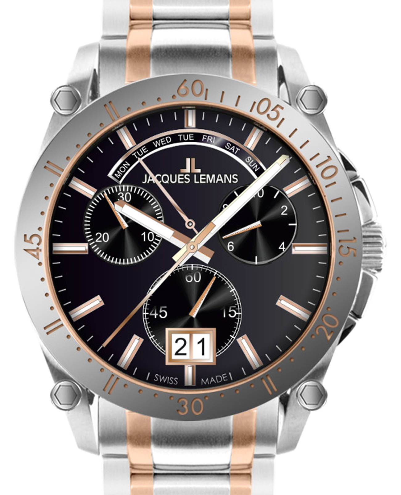 Мужские часы-хронографХронографФункция позволяет измерять отрезки времени с особой точностью: часы, минуты, секунды. Верным признаком хронографа является наличие на циферблате 3 дополнительных окошек-счётчиков. Jacques Lemans 1-2198G – лаконичная красота и изысканная элегантность. Оригинальная модель с классическим оформлением станет превосходным завершением образа, наделив его индивидуальным характером. Корпус выполнен из нержавеющей стали, диаметром 44 мм, что обеспечивает долговечность и утончённый внешний вид. Ударопрочное минеральное стеклоМинеральное стеклоМинеральное стекло представляет собой искусственно выращенный минерал кварца. Такое стекло отличается особой устойчивостью к повреждениям и царапинам. Уступает по некоторым качествам сапфировому стеклу. с сапфировым напылением защищает циферблат от царапин. Стальной браслет с частичным IP-покрытиемIP-покрытиеМетод ионного напыления. Демонстрирует повышенную устойчивость к истиранию, окислению и химическим веществам. Под воздействием высокого давления и температуры около 1500°C молекулы металла надёжно соединяются с частицами корпуса часов. на раскладной застёжкеРаскладная застёжкаТакой тип застёжки используется только на браслетах из металла. Она никогда не раскрывается полностью, происходит разделение на 2 и более частей. Раскладывающая застёжка снизит вероятность потери часов к минимуму. обеспечивает комфортное ношение. Водозащита 100 метров позволит плавать, нырять и заниматься другими водными видами спорта. Стрелки и метки с люминесцентным покрытиемЛюминесцентное покрытиеПозволяет считывать показания времени в темноте. Производители наносят на стрелки, часовые индексы, безель или поверхность циферблата светонакопительный состав, дающий холодное свечение. позволяющие легко определять время даже в темноте. Окошко даты находится в положении 6 часов. Широкое окошко дня недели в положении 12 часов позволяет показывать название дня недели. Это аксессуар для мужчины, который ценит классический стиль и функциональность.