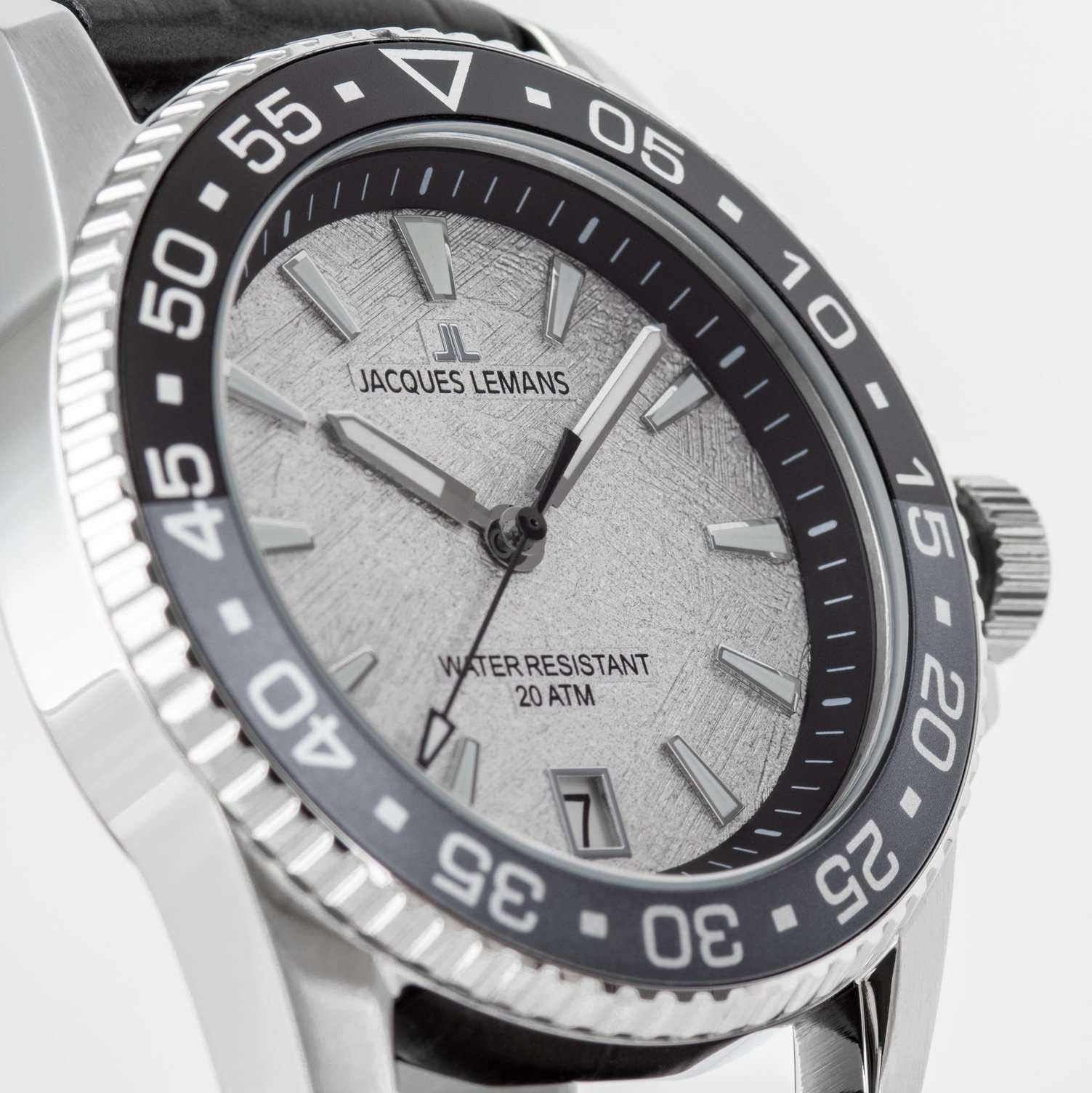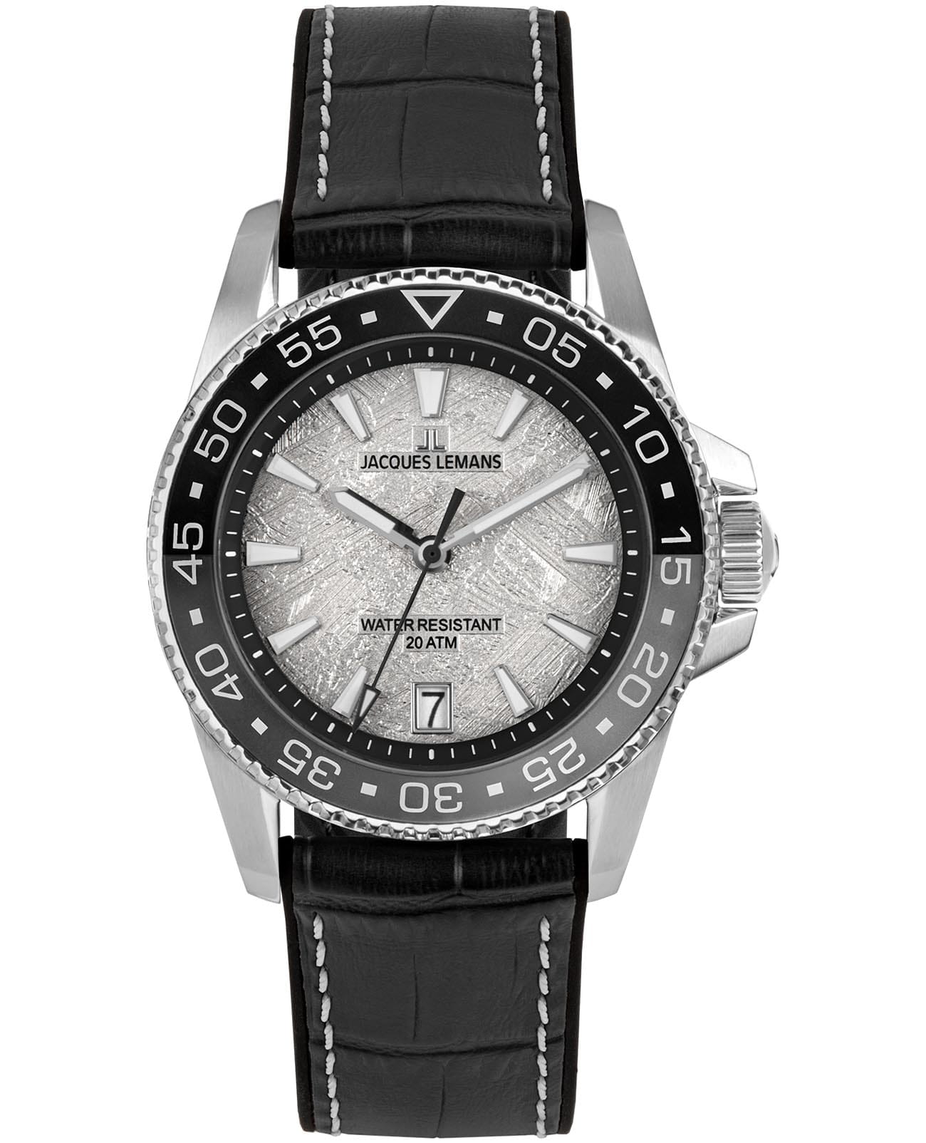 Мужские спортивные часы Jacques Lemans Liverpool Diver 1-2205E представляют собой стильный аксессуар, отражающий идеальное сочетание современного дизайна, надёжности и функциональности. Корпус из нержавеющей стали диаметром 41 мм идеально сбалансирован и элегантен. Ударопрочное минеральное стеклоМинеральное стеклоМинеральное стекло представляет собой искусственно выращенный минерал кварца. Такое стекло отличается особой устойчивостью к повреждениям и царапинам. Уступает по некоторым качествам сапфировому стеклу. Crystex защищает циферблат от царапин. Широкий безельБезельВнешний ободок, закрепляющий стекло. В спортивных часах так называется поворотное кольцо с делениями на циферблате, выполняет роль таймера – замеряет отрезки времени на шкале. Неподвижный безель – элемент декора. Однонаправленно вращающийся безель на дайверских часах позволяет фиксировать моменты погружения и выныривания на поверхность. с PVD-покрытиемPVDУльтратонкое покрытие наносится в технике вакуумного напыления, сочетает в себе нитрид титана особой прочности со слоем золота или оксида хрома. Несёт в себе декоративную или защитную функцию., на который вынесена дополнительная индикация секунд. Ремешок черного цвета состоит из двух частей: внутренняя сделана из силикона, материала, который не боится повышенной влажности, внешняя — из натуральной кожи. Водозащита 200 метров позволит плавать, нырять и заниматься другими водными видами спорта. Стрелки и метки с люминесцентным покрытиемЛюминесцентное покрытиеПозволяет считывать показания времени в темноте. Производители наносят на стрелки, часовые индексы, безель или поверхность циферблата светонакопительный состав, дающий холодное свечение. позволяющие легко определять время даже в темноте. Окошко даты находится в положении 6 часов. Это аксессуар для мужчины, который ценит классический стиль и функциональность.