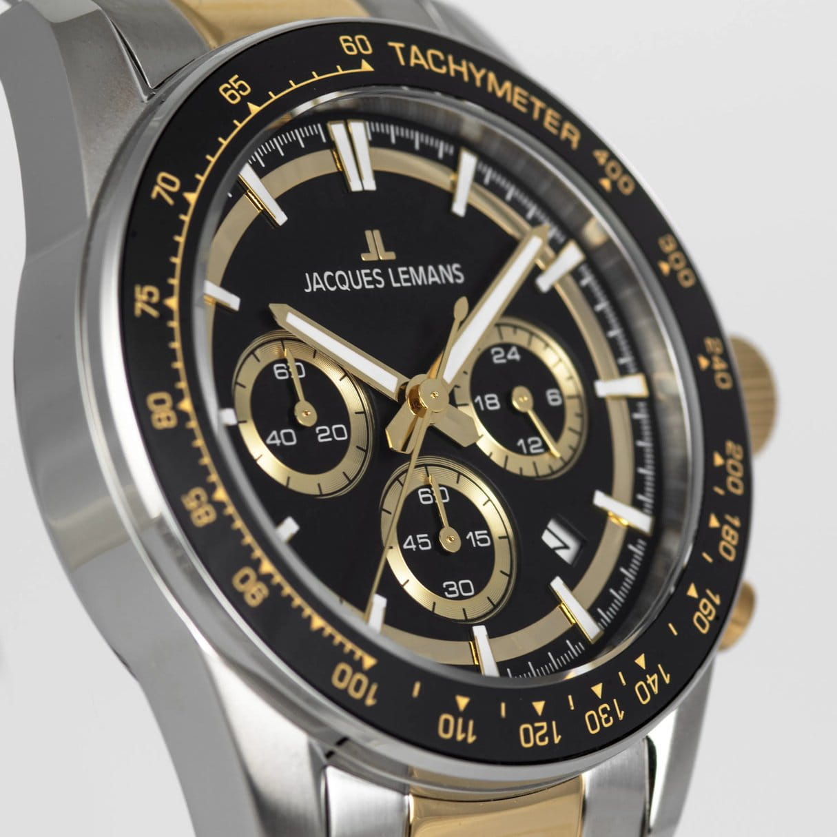 Мужские кварцевые часы-хронографХронографФункция позволяет измерять отрезки времени с особой точностью: часы, минуты, секунды. Верным признаком хронографа является наличие на циферблате 3 дополнительных окошек-счётчиков. с секундомеромСекундомерСекундоме́р — прибор, способный измерять интервалы времени с точностью до долей секунды. Jacques Lemans 1-2207D – лаконичная красота и изысканная элегантность. Оригинальная модель с классическим оформлением станет превосходным завершением образа, наделив его индивидуальным характером. Корпус выполнен из нержавеющей стали серебристого цвета, диаметром 43 мм, что обеспечивает долговечность и утончённый внешний вид. Минеральное стеклоМинеральное стеклоМинеральное стекло представляет собой искусственно выращенный минерал кварца. Такое стекло отличается особой устойчивостью к повреждениям и царапинам. Уступает по некоторым качествам сапфировому стеклу. повышенной прочности Crystex защищает циферблат от царапин. Неподвижный безельБезельВнешний ободок, закрепляющий стекло. В спортивных часах так называется поворотное кольцо с делениями на циферблате, выполняет роль таймера – замеряет отрезки времени на шкале. Неподвижный безель – элемент декора. Однонаправленно вращающийся безель на дайверских часах позволяет фиксировать моменты погружения и выныривания на поверхность. с PVD-покрытиемPVDУльтратонкое покрытие наносится в технике вакуумного напыления, сочетает в себе нитрид титана особой прочности со слоем золота или оксида хрома. Несёт в себе декоративную или защитную функцию. и тахиметромТахиметрРазмеченная шкала, располагается на ободке или безеле часов. Тахиметр позволяет рассчитать скорость на определённом участке пути, расстояние измеряется в километрах или милях.. Стальной браслет с частичным PVD-покрытиемPVDУльтратонкое покрытие наносится в технике вакуумного напыления, сочетает в себе нитрид титана особой прочности со слоем золота или оксида хрома. Несёт в себе декоративную или защитную функцию. на раскладной застёжке с фиксаторомРаскладная застёжкаТакой тип застёжки используется только на браслетах из металла. Она никогда не раскрывается полностью, происходит разделение на 2 и более частей. Раскладывающая застёжка снизит вероятность потери часов к минимуму. обеспечивает комфортное ношение Водозащита 200 метров позволит плавать, нырять и заниматься другими водными видами спорта. Стрелки и метки с люминесцентным покрытиемЛюминесцентное покрытиеПозволяет считывать показания времени в темноте. Производители наносят на стрелки, часовые индексы, безель или поверхность циферблата светонакопительный состав, дающий холодное свечение. позволяющие легко определять время даже в темноте. 12-ти и 24-х часовой формат времени. Окошко даты находится в положении между 4 и 5 часами. Рифленая заводная головка с защитой. Это аксессуар для мужчины, который ценит классический стиль и функциональность.