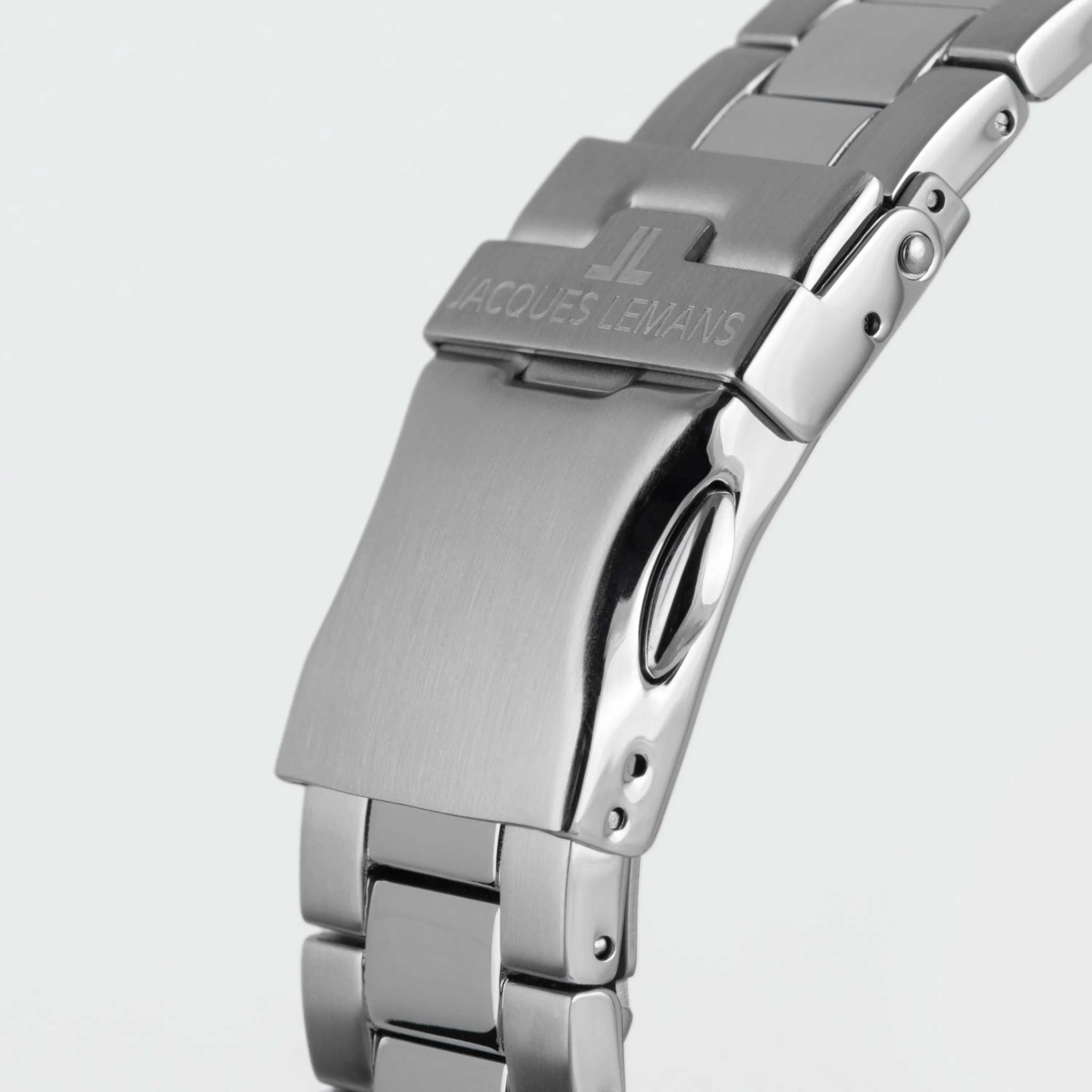 Мужские кварцевые часы-хронографХронографФункция позволяет измерять отрезки времени с особой точностью: часы, минуты, секунды. Верным признаком хронографа является наличие на циферблате 3 дополнительных окошек-счётчиков. с секундомеромСекундомерСекундоме́р — прибор, способный измерять интервалы времени с точностью до долей секунды. Jacques Lemans 1-2207E – лаконичная красота и изысканная элегантность. Оригинальная модель с классическим оформлением станет превосходным завершением образа, наделив его индивидуальным характером. Корпус выполнен из нержавеющей стали серебристого цвета, диаметром 43 мм, что обеспечивает долговечность и утончённый внешний вид. Минеральное стеклоМинеральное стеклоМинеральное стекло представляет собой искусственно выращенный минерал кварца. Такое стекло отличается особой устойчивостью к повреждениям и царапинам. Уступает по некоторым качествам сапфировому стеклу. повышенной прочности Crystex защищает циферблат от царапин. Неподвижный безельБезельВнешний ободок, закрепляющий стекло. В спортивных часах так называется поворотное кольцо с делениями на циферблате, выполняет роль таймера – замеряет отрезки времени на шкале. Неподвижный безель – элемент декора. Однонаправленно вращающийся безель на дайверских часах позволяет фиксировать моменты погружения и выныривания на поверхность. с PVD-покрытиемPVDУльтратонкое покрытие наносится в технике вакуумного напыления, сочетает в себе нитрид титана особой прочности со слоем золота или оксида хрома. Несёт в себе декоративную или защитную функцию. и тахиметромТахиметрРазмеченная шкала, располагается на ободке или безеле часов. Тахиметр позволяет рассчитать скорость на определённом участке пути, расстояние измеряется в километрах или милях.. Стальной браслет на раскладной застёжке с фиксаторомРаскладная застёжкаТакой тип застёжки используется только на браслетах из металла. Она никогда не раскрывается полностью, происходит разделение на 2 и более частей. Раскладывающая застёжка снизит вероятность потери часов к минимуму. обеспечивает комфортное ношение Водозащита 200 метров позволит плавать, нырять и заниматься другими водными видами спорта. Стрелки и метки с люминесцентным покрытиемЛюминесцентное покрытиеПозволяет считывать показания времени в темноте. Производители наносят на стрелки, часовые индексы, безель или поверхность циферблата светонакопительный состав, дающий холодное свечение. позволяющие легко определять время даже в темноте. 12-ти и 24-х часовой формат времени. Окошко даты находится в положении между 4 и 5 часами. Рифленая заводная головка с защитой. Это аксессуар для мужчины, который ценит классический стиль и функциональность.