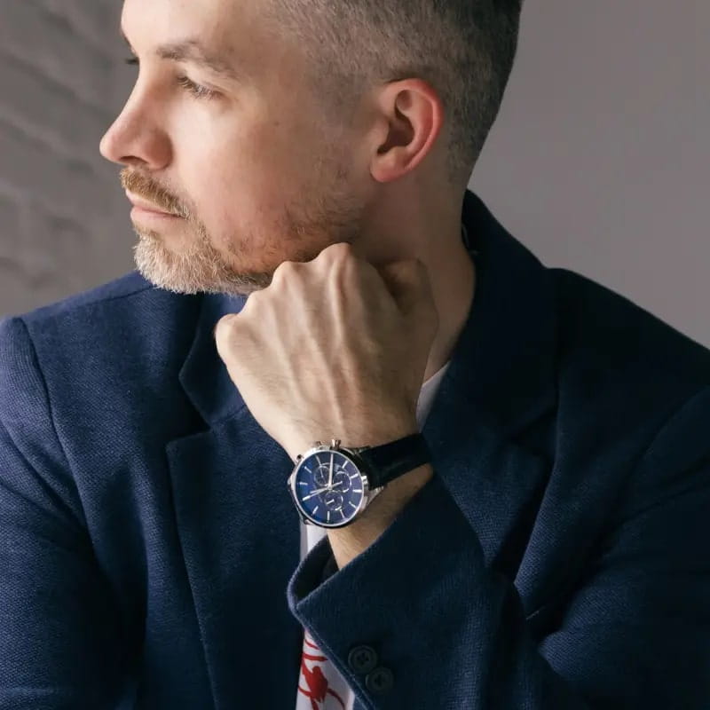 Водозащита 5 ATM защищает часы от брызг и дождя. Кожаный ремешок синего цвета с классической застёжкой обеспечивает комфортное ношение и надёжную фиксацию на запястье.
