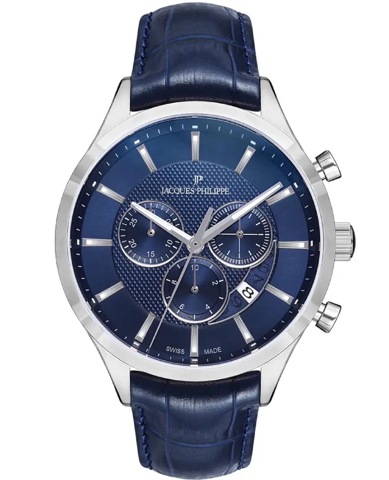 Часы Jacques Philippe JPQGC031132 сочетают в себе элегантный дизайн и высокое качество швейцарского часового мастерства. Корпус диаметром 43 мм выполнен из нержавеющей стали, а синий циферблат защищён сапфировым стекломСапфировое стеклоПрочный и надёжный материал из кристалла сапфира синтетического происхождения, характеризующийся особой твёрдостью и устойчивостью к царапинам и повреждениям..
