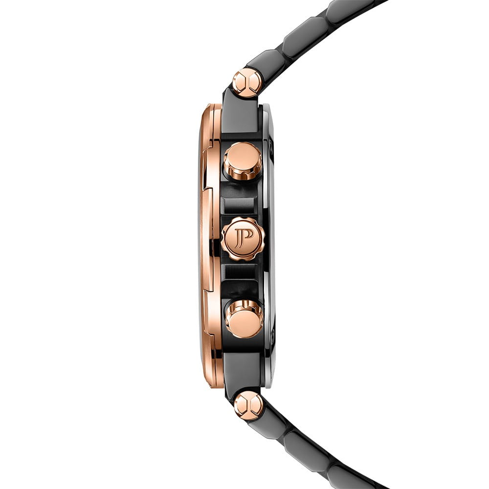 Jacques Philippe Corus JPQGC443347 — стильные швейцарские часы с функцией хронографаХронографФункция позволяет измерять отрезки времени с особой точностью: часы, минуты, секунды. Верным признаком хронографа является наличие на циферблате 3 дополнительных окошек-счётчиков. и секундомераСекундомерСекундоме́р — прибор, способный измерять интервалы времени с точностью до долей секунды., которые сочетают в себе элегантность и современный функционал. Модель оснащена точным кварцевым механизмом и надежным корпусом из нержавеющей стали 316L с черным IP-покрытиемIP-покрытиеМетод ионного напыления. Демонстрирует повышенную устойчивость к истиранию, окислению и химическим веществам. Под воздействием высокого давления и температуры около 1500°C молекулы металла надёжно соединяются с частицами корпуса часов., что гарантирует долговечность и устойчивость к механическим воздействиям. БезельБезельВнешний ободок, закрепляющий стекло. В спортивных часах так называется поворотное кольцо с делениями на циферблате, выполняет роль таймера – замеряет отрезки времени на шкале. Неподвижный безель – элемент декора. Однонаправленно вращающийся безель на дайверских часах позволяет фиксировать моменты погружения и выныривания на поверхность. с розово-золотистым IP-покрытиемIP-покрытиеМетод ионного напыления. Демонстрирует повышенную устойчивость к истиранию, окислению и химическим веществам. Под воздействием высокого давления и температуры около 1500°C молекулы металла надёжно соединяются с частицами корпуса часов., придающим изделию дополнительную прочность и стильный внешний вид. Сапфировое стеклоСапфировое стеклоПрочный и надёжный материал из кристалла сапфира синтетического происхождения, характеризующийся особой твёрдостью и устойчивостью к царапинам и повреждениям. отличается высокой прозрачностью и устойчивостью к царапинам, сохраняя безупречный внешний вид часов даже при активном использовании. Черный циферблат украшен тремя дополнительными индикаторами и удобным окошком даты в положении «4 часа», а стрелки с люминесцентным покрытиемЛюминесцентное покрытиеПозволяет считывать показания времени в темноте. Производители наносят на стрелки, часовые индексы, безель или поверхность циферблата светонакопительный состав, дающий холодное свечение. обеспечивают отличную читаемость в любое время суток. Браслет из нержавеющей стали 316 с черным IP-покрытиемIP-покрытиеМетод ионного напыления. Демонстрирует повышенную устойчивость к истиранию, окислению и химическим веществам. Под воздействием высокого давления и температуры около 1500°C молекулы металла надёжно соединяются с частицами корпуса часов. оснащен удобной застежкой «бабочка»Застёжка "бабочка"Такой вид застёжки дополняется предохранителями, помогающими избежать случайного раскрытия браслета. Обладают изящным исполнением. , что обеспечивает комфорт и надежность при носке. Класс водозащиты 10 ATM (100 метров) позволяет не снимать часы во время мытья рук или прогулок под дождем.
