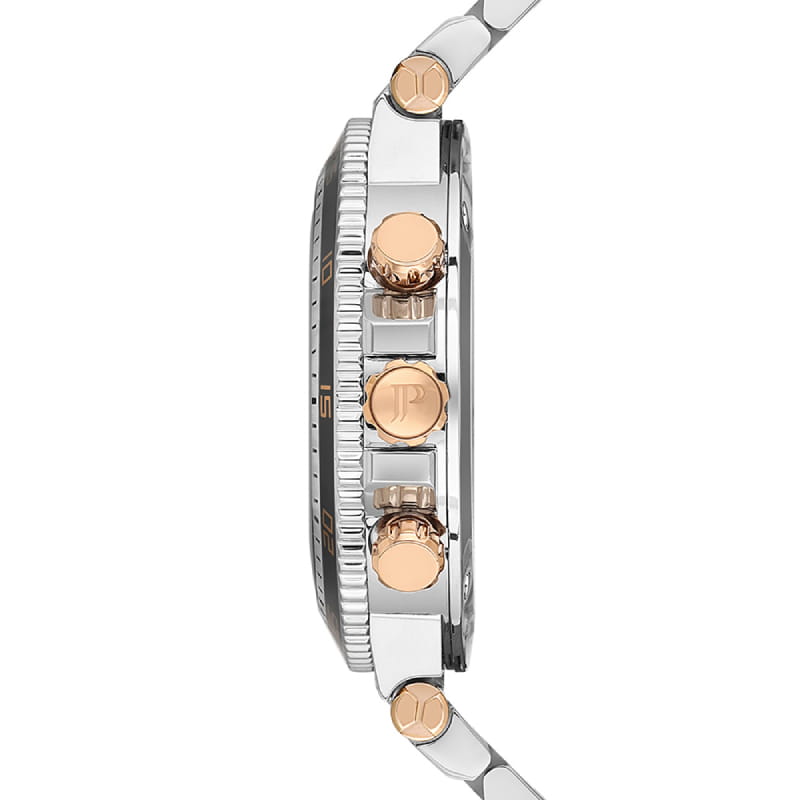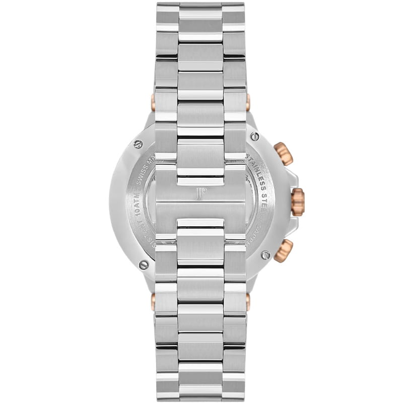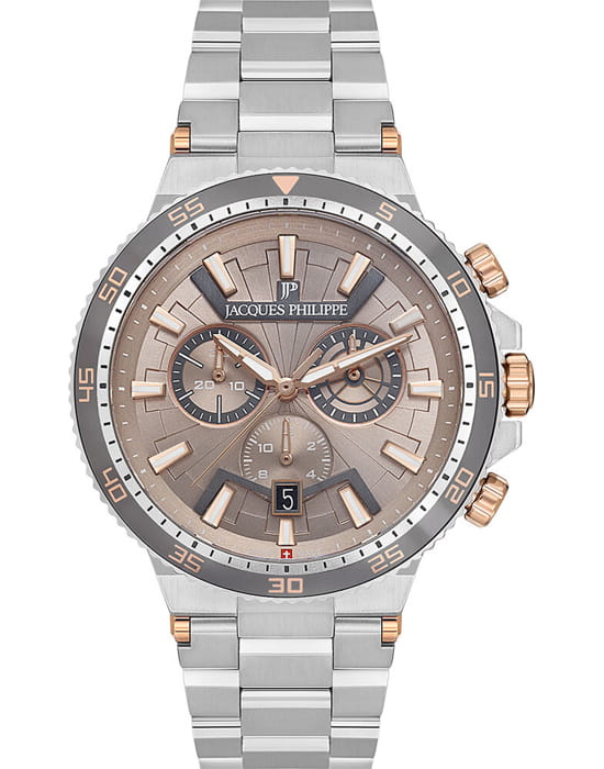 Швейцарские мужские часы-хронографХронографФункция позволяет измерять отрезки времени с особой точностью: часы, минуты, секунды. Верным признаком хронографа является наличие на циферблате 3 дополнительных окошек-счётчиков. Jacques Philippe Dynamo JPQGC447346SB, кварцевый механизм с высокой точностью. Сапфировое стеклоСапфировое стеклоПрочный и надёжный материал из кристалла сапфира синтетического происхождения, характеризующийся особой твёрдостью и устойчивостью к царапинам и повреждениям. устойчивое к появлению царапин, обладающее высокой прозрачностью. Корпус часов изготовлен из нержавеющей стали. На циферблате три дополнительных индикатора. Стрелки и метки с люминесцентным покрытиемЛюминесцентное покрытиеПозволяет считывать показания времени в темноте. Производители наносят на стрелки, часовые индексы, безель или поверхность циферблата светонакопительный состав, дающий холодное свечение.. Окошко даты находится в положении 6 часов. Класс водозащиты: 100 метров, позволит плавать, нырять и заниматься другими водными видами спорта. Стальной браслет на застёжке «бабочка» с кнопкамиЗастёжка "бабочка"Такой вид застёжки дополняется предохранителями, помогающими избежать случайного раскрытия браслета. Обладают изящным исполнением. .