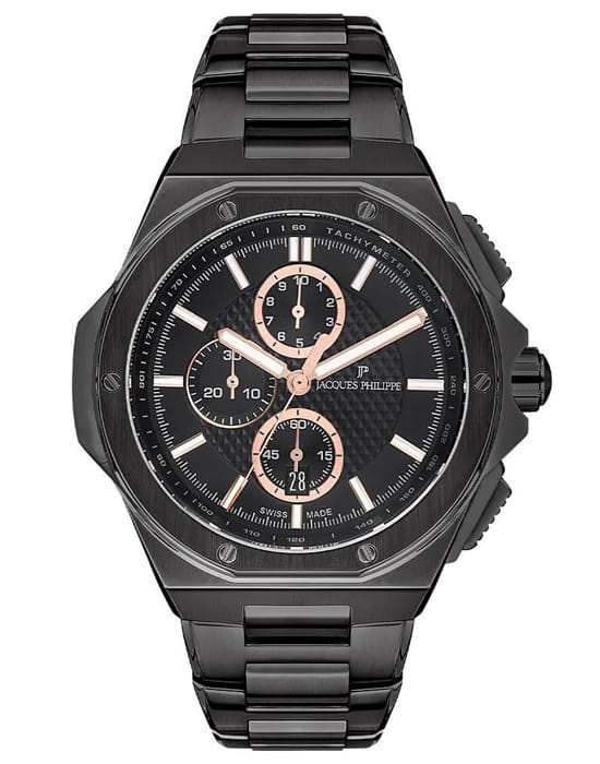 Швейцарские мужские часы-хронографХронографФункция позволяет измерять отрезки времени с особой точностью: часы, минуты, секунды. Верным признаком хронографа является наличие на циферблате 3 дополнительных окошек-счётчиков. с секундомеромСекундомерСекундоме́р — прибор, способный измерять интервалы времени с точностью до долей секунды. Jacques Philippe Esquire JPQGC484311, кварцевый механизм с высокой точностью. Сапфировое стеклоСапфировое стеклоПрочный и надёжный материал из кристалла сапфира синтетического происхождения, характеризующийся особой твёрдостью и устойчивостью к царапинам и повреждениям. устойчивое к появлению царапин, обладающее высокой прозрачностью. Корпус часов изготовлен из нержавеющей стали 316L с PVD-покрытиемPVDУльтратонкое покрытие наносится в технике вакуумного напыления, сочетает в себе нитрид титана особой прочности со слоем золота или оксида хрома. Несёт в себе декоративную или защитную функцию.. На циферблате три дополнительных индикатора. Стрелки и метки с люминесцентным покрытиемЛюминесцентное покрытиеПозволяет считывать показания времени в темноте. Производители наносят на стрелки, часовые индексы, безель или поверхность циферблата светонакопительный состав, дающий холодное свечение.. Шкала тахиметраТахиметрРазмеченная шкала, располагается на ободке или безеле часов. Тахиметр позволяет рассчитать скорость на определённом участке пути, расстояние измеряется в километрах или милях. на циферблате. Класс водозащиты: 50 метров, позволит защитить корпус от случайных брызг или капель дождя. Стальной браслет с PVD-покрытиемPVDУльтратонкое покрытие наносится в технике вакуумного напыления, сочетает в себе нитрид титана особой прочности со слоем золота или оксида хрома. Несёт в себе декоративную или защитную функцию. на застёжке «бабочка»Застёжка "бабочка"Такой вид застёжки дополняется предохранителями, помогающими избежать случайного раскрытия браслета. Обладают изящным исполнением. .