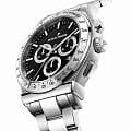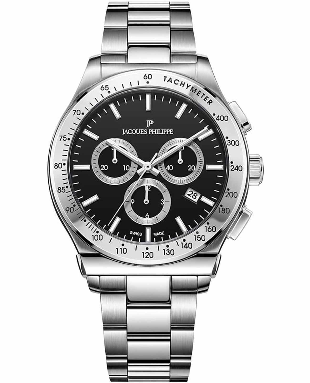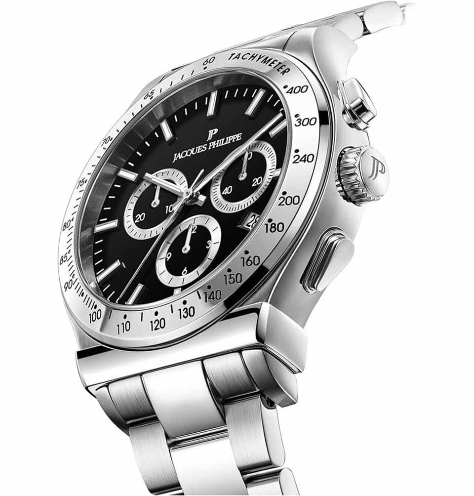 Jacques Philippe JPQGC701316 — швейцарские наручные часы, которые станут идеальным дополнением к образу современного мужчины, ценящего стиль и качество, это стильные швейцарские часы с функцией хронографаХронографФункция позволяет измерять отрезки времени с особой точностью: часы, минуты, секунды. Верным признаком хронографа является наличие на циферблате 3 дополнительных окошек-счётчиков. и секундомераСекундомерСекундоме́р — прибор, способный измерять интервалы времени с точностью до долей секунды.. Корпус и браслет выполнены из высокопрочной нержавеющей стали 316L, что подчеркивает статус владельца и гарантирует долговечность аксессуара. Классический дизайн с черным циферблатом гармонично сочетается с современными деталями: тахиметрическаяТахиметрРазмеченная шкала, располагается на ободке или безеле часов. Тахиметр позволяет рассчитать скорость на определённом участке пути, расстояние измеряется в километрах или милях. шкала на безелеБезельВнешний ободок, закрепляющий стекло. В спортивных часах так называется поворотное кольцо с делениями на циферблате, выполняет роль таймера – замеряет отрезки времени на шкале. Неподвижный безель – элемент декора. Однонаправленно вращающийся безель на дайверских часах позволяет фиксировать моменты погружения и выныривания на поверхность. добавляет функциональности, а окошко даты, расположенное на отметке «4 часа», обеспечивает дополнительное удобство. Сапфировое стеклоСапфировое стеклоПрочный и надёжный материал из кристалла сапфира синтетического происхождения, характеризующийся особой твёрдостью и устойчивостью к царапинам и повреждениям. надежно защищает часы от царапин и повреждений, сохраняя их безупречный внешний вид. Кварцевый механизм обеспечивает точный ход и не требует частого обслуживания. Водозащита до 10 атмосфер (100 метров) позволяет не снимать часы во время плавания. Стрелки имеют люминесцентное покрытиеЛюминесцентное покрытиеПозволяет считывать показания времени в темноте. Производители наносят на стрелки, часовые индексы, безель или поверхность циферблата светонакопительный состав, дающий холодное свечение. для удобства чтения времени в темноте. Стальной браслет шириной 20 мм оснащен застежкой «бабочка»Застёжка "бабочка"Такой вид застёжки дополняется предохранителями, помогающими избежать случайного раскрытия браслета. Обладают изящным исполнением. для комфортного ношения в течение всего дня.