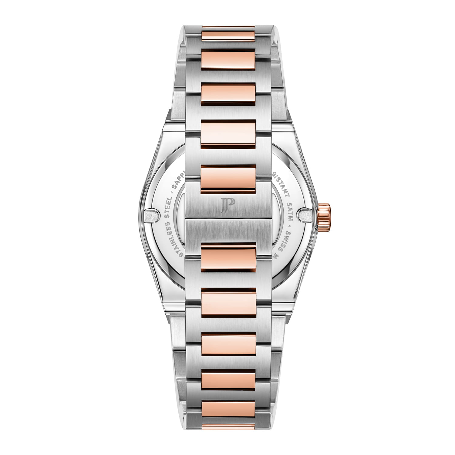 Часы Jacques Philippe JPQGLS587328RG из коллекции Borealis — элегантные женские часы, сочетающие в себе швейцарское качество и современный дизайн. Корпус диаметром 40мм выполнен из нержавеющей стали с PVD-покрытиемPVDУльтратонкое покрытие наносится в технике вакуумного напыления, сочетает в себе нитрид титана особой прочности со слоем золота или оксида хрома. Несёт в себе декоративную или защитную функцию., а зеленый циферблат защищён сапфировым стекломСапфировое стеклоПрочный и надёжный материал из кристалла сапфира синтетического происхождения, характеризующийся особой твёрдостью и устойчивостью к царапинам и повреждениям.. БезельБезельВнешний ободок, закрепляющий стекло. В спортивных часах так называется поворотное кольцо с делениями на циферблате, выполняет роль таймера – замеряет отрезки времени на шкале. Неподвижный безель – элемент декора. Однонаправленно вращающийся безель на дайверских часах позволяет фиксировать моменты погружения и выныривания на поверхность. с PVD-покрытиемPVDУльтратонкое покрытие наносится в технике вакуумного напыления, сочетает в себе нитрид титана особой прочности со слоем золота или оксида хрома. Несёт в себе декоративную или защитную функцию.. Внутри установлен швейцарский кварцевый механизм, обеспечивающий высокую точность хода. Водозащита 50 метров (5 ATM) защищает часы от брызг и дождя. Браслет из нержавеющей стали с PVD-покрытиемPVDУльтратонкое покрытие наносится в технике вакуумного напыления, сочетает в себе нитрид титана особой прочности со слоем золота или оксида хрома. Несёт в себе декоративную или защитную функцию. и застёжкой бабочкаЗастёжка "бабочка"Такой вид застёжки дополняется предохранителями, помогающими избежать случайного раскрытия браслета. Обладают изящным исполнением. обеспечивает комфортное ношение и надёжную фиксацию на запястье. Эти часы подойдут для тех, кто ценит сочетание элегантного дизайна и функциональности.