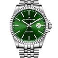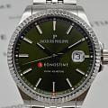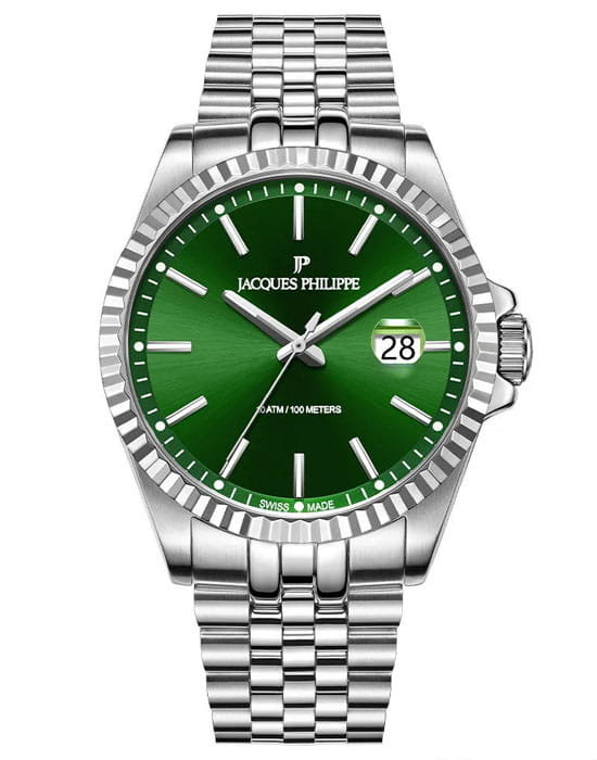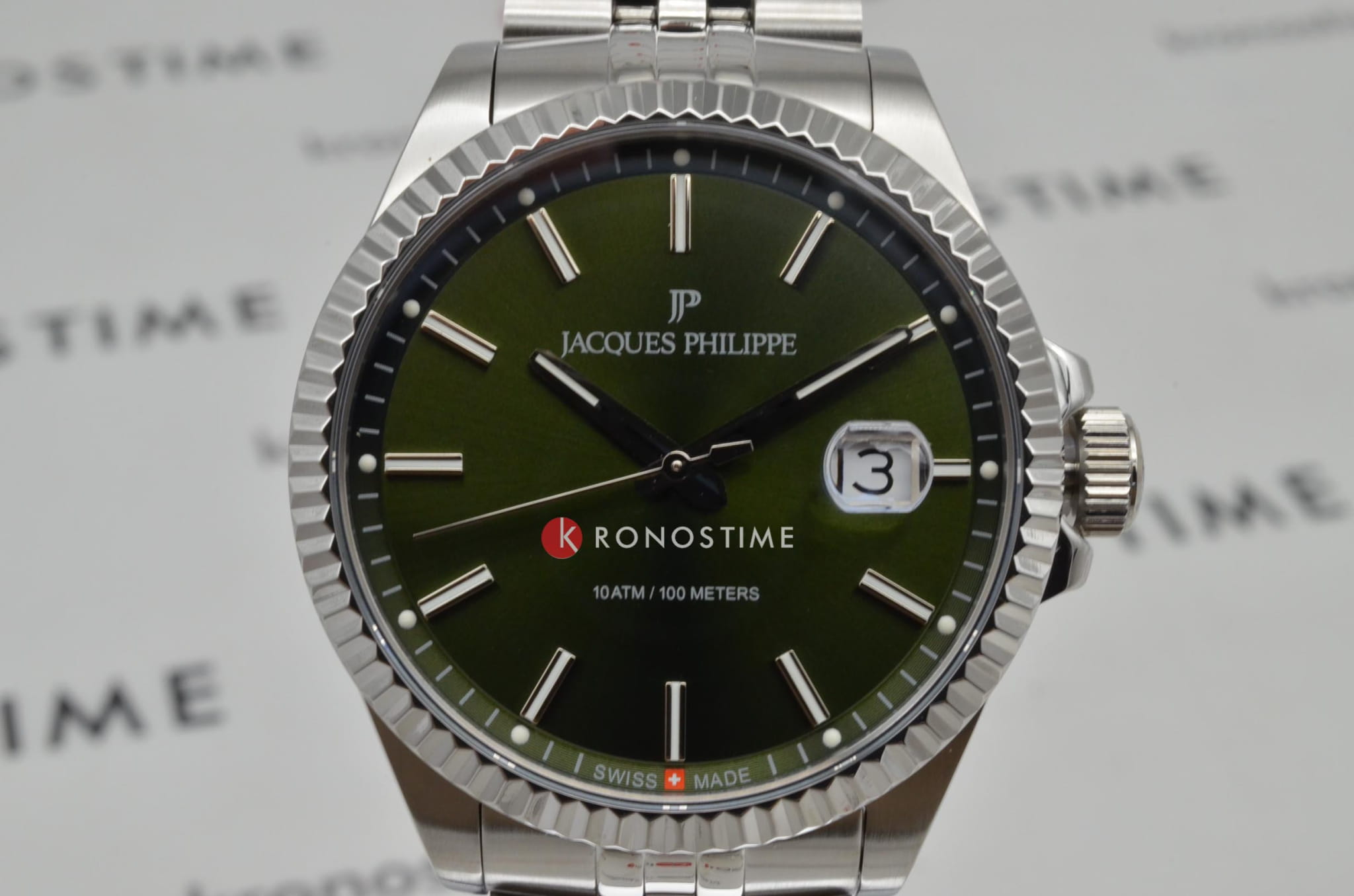 Jacques Philippe JPQGS5913X6V2 — мужские часы в сдержанном классическом исполнении с акцентом на простоту и надёжность. Корпус диаметром 40 мм выполнен из нержавеющей стали, а его умеренная толщина — около 12 мм — делает модель универсальной и комфортной в повседневной носке. Циферблат оформлен в светлом зеленом тоне с тонкими стрелками, лаконичными часовыми метками и аккуратным окошком даты в позиции «3 часа». Минималистичный стиль подчёркивает строгость и чистоту дизайна. Поверхность защищена устойчивым к царапинам сапфировым стекломСапфировое стеклоПрочный и надёжный материал из кристалла сапфира синтетического происхождения, характеризующийся особой твёрдостью и устойчивостью к царапинам и повреждениям., которое обеспечивает хорошую читаемость и долговечность. Механизм — точный швейцарский кварц, не требующий подзавода. Он обеспечивает стабильную и бесперебойную работу часов, сохраняя точность в любых условиях. Браслет из нержавеющей стали визуально продолжает корпус и фиксируется с помощью надёжной застёжки, обеспечивая комфортную посадку. Ширина браслета — 22 мм. Водозащита до 10 ATM позволяет использовать часы не только в повседневной жизни, но и при активности на воде. Jacques Philippe — это надёжная и универсальная модель для тех, кто ценит швейцарскую точность, простоту и уверенный стиль без лишних деталей.