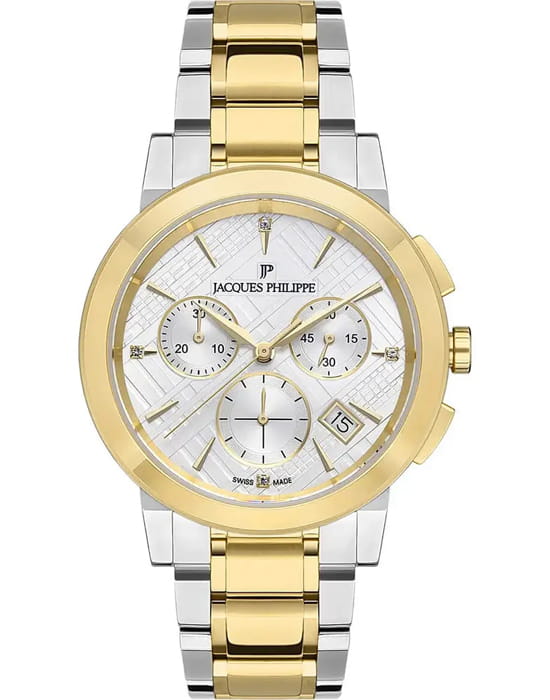 Швейцарские женские часы c хронографомХронографФункция позволяет измерять отрезки времени с особой точностью: часы, минуты, секунды. Верным признаком хронографа является наличие на циферблате 3 дополнительных окошек-счётчиков. Jacques Philippe Cosmos JPQLC327328, кварцевый механизм с высокой точностью. Сапфировое стеклоСапфировое стеклоПрочный и надёжный материал из кристалла сапфира синтетического происхождения, характеризующийся особой твёрдостью и устойчивостью к царапинам и повреждениям. устойчивое к появлению царапин, обладающее высокой прозрачностью. Корпус часов изготовлен из нержавеющей стали. Класс водозащиты: 50 метров, позволит защитить корпус от случайных брызг или капель дождя. Стальной браслет с PVD-покрытиемPVDУльтратонкое покрытие наносится в технике вакуумного напыления, сочетает в себе нитрид титана особой прочности со слоем золота или оксида хрома. Несёт в себе декоративную или защитную функцию. на застёжке-бабочке с кнопкамиЗастёжка "бабочка"Такой вид застёжки дополняется предохранителями, помогающими избежать случайного раскрытия браслета. Обладают изящным исполнением. . Окошко даты находится в положении между 4 и 5 часов. Циферблат инкрустирован кристаллами.