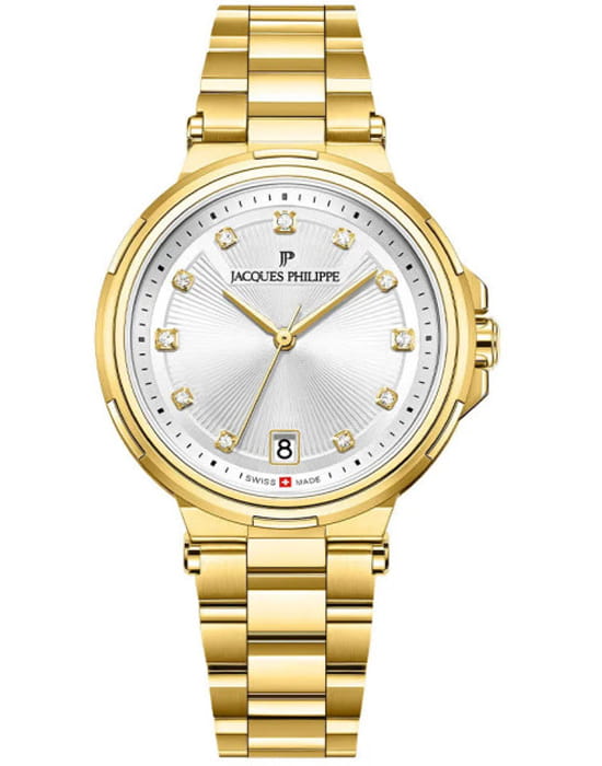 Часы Jacques Philippe JPQLS452324S из коллекции Novellus — элегантные женские часы, сочетающие швейцарское качество и современный дизайн. Корпус диаметром 36 мм выполнен из нержавеющей стали с PVD-покрытиемPVDУльтратонкое покрытие наносится в технике вакуумного напыления, сочетает в себе нитрид титана особой прочности со слоем золота или оксида хрома. Несёт в себе декоративную или защитную функцию. цвета золота, а серебристый циферблат защищён сапфировым стекломСапфировое стеклоПрочный и надёжный материал из кристалла сапфира синтетического происхождения, характеризующийся особой твёрдостью и устойчивостью к царапинам и повреждениям.. Циферблат инкрустирован кристаллами. Внутри установлен швейцарский кварцевый механизм, обеспечивающий высокую точность хода. Водозащита 50 метров (5 ATM) защищает часы от брызг и дождя. Браслет из нержавеющей стали с PVD-покрытиемPVDУльтратонкое покрытие наносится в технике вакуумного напыления, сочетает в себе нитрид титана особой прочности со слоем золота или оксида хрома. Несёт в себе декоративную или защитную функцию. цвета золота и застёжкой бабочкаЗастёжка "бабочка"Такой вид застёжки дополняется предохранителями, помогающими избежать случайного раскрытия браслета. Обладают изящным исполнением. обеспечивает комфортное ношение и надёжную фиксацию на запястье. Эти часы идеально подойдут для тех, кто ценит сочетание элегантного дизайна и функциональности.