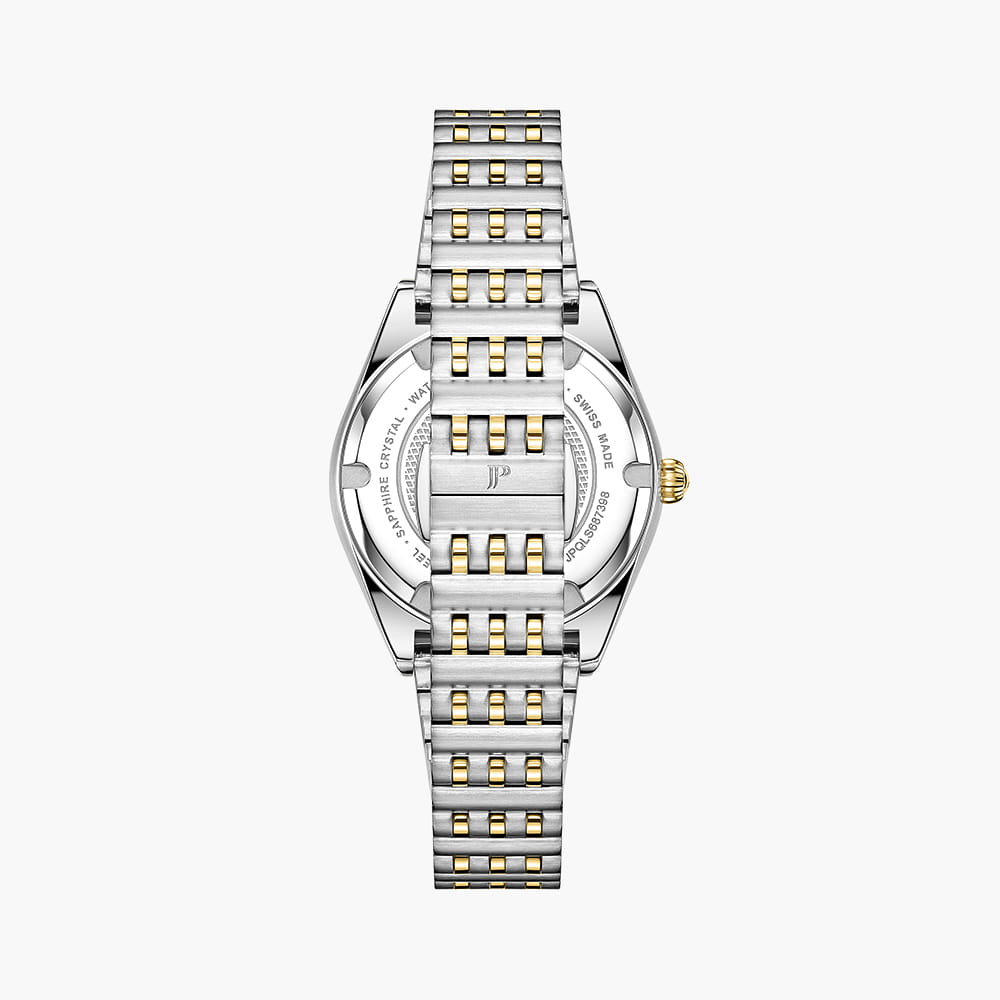 Jacques Philippe Radiante JPQLS687398 — изящная женская модель коллекции Radiante с кварцевым механизмом, сочетающая классический стиль и практичность. Корпус диаметром 33 мм выполнен из нержавеющей стали и полированными поверхностями, безельБезельВнешний ободок, закрепляющий стекло. В спортивных часах так называется поворотное кольцо с делениями на циферблате, выполняет роль таймера – замеряет отрезки времени на шкале. Неподвижный безель – элемент декора. Однонаправленно вращающийся безель на дайверских часах позволяет фиксировать моменты погружения и выныривания на поверхность. с PVDPVDУльтратонкое покрытие наносится в технике вакуумного напыления, сочетает в себе нитрид титана особой прочности со слоем золота или оксида хрома. Несёт в себе декоративную или защитную функцию. инкрустирован кристаллами, что придаёт часам утончённый блеск. Водозащита до 5 атм (50 м) позволяет носить модель в повседневных условиях. Выпуклое сапфировое стеклоСапфировое стеклоПрочный и надёжный материал из кристалла сапфира синтетического происхождения, характеризующийся особой твёрдостью и устойчивостью к царапинам и повреждениям. обеспечивает защиту от царапин и сохраняет высокую прозрачность, делая циферблат легко читаемым. Модель оснащена точным швейцарским кварцевым механизмом с индикацией часов, минут и секунд. Циферблат оформлен в лаконичном стиле с аккуратными метками, а браслет из нержавеющей стали с частичным PVDPVDУльтратонкое покрытие наносится в технике вакуумного напыления, сочетает в себе нитрид титана особой прочности со слоем золота или оксида хрома. Несёт в себе декоративную или защитную функцию.-покрытием гармонично завершает образ, подчёркивая универсальность и элегантность этих часов.