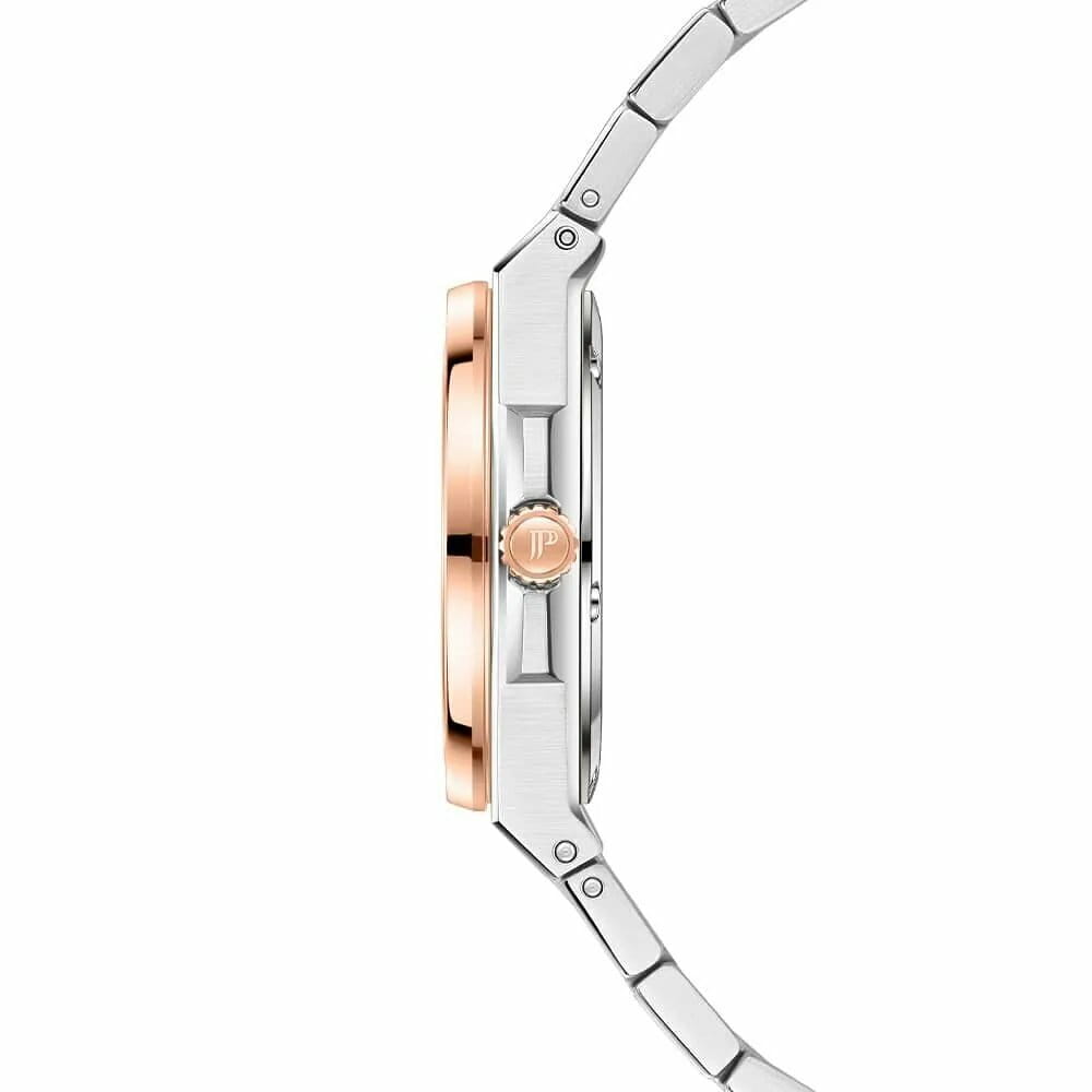 Jacques Philippe Bellus JPQLS727328RG — изящная женская модель коллекции Bellus с точным кварцевым механизмом Swiss Made, где корпус диаметром 33 мм и толщиной 5 мм выполнен из нержавеющей стали, а безельБезельВнешний ободок, закрепляющий стекло. В спортивных часах так называется поворотное кольцо с делениями на циферблате, выполняет роль таймера – замеряет отрезки времени на шкале. Неподвижный безель – элемент декора. Однонаправленно вращающийся безель на дайверских часах позволяет фиксировать моменты погружения и выныривания на поверхность. с PVDPVDУльтратонкое покрытие наносится в технике вакуумного напыления, сочетает в себе нитрид титана особой прочности со слоем золота или оксида хрома. Несёт в себе декоративную или защитную функцию.-покрытием инкрустирован кристаллами, придающими модели утончённый блеск. Выпуклое сапфировое стеклоСапфировое стеклоПрочный и надёжный материал из кристалла сапфира синтетического происхождения, характеризующийся особой твёрдостью и устойчивостью к царапинам и повреждениям. обеспечивает высокую стойкость к царапинам и сохраняет прозрачность. Водозащита составляет 5 ATM (50 м). Браслет из нержавеющей стали с PVDPVDУльтратонкое покрытие наносится в технике вакуумного напыления, сочетает в себе нитрид титана особой прочности со слоем золота или оксида хрома. Несёт в себе декоративную или защитную функцию.-покрытием гармонично завершает дизайн, подчёркивая элегантность и целостность образа.