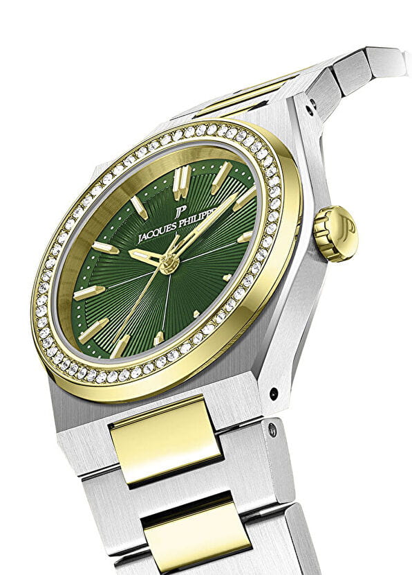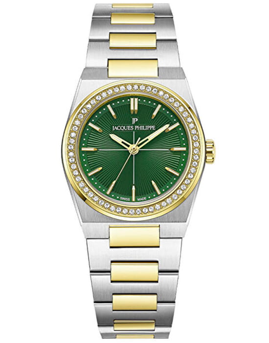 Часы Jacques Philippe JPQLS8673X8 из коллекции Adastra — элегантные женские часы, сочетающие швейцарское качество и современный дизайн. Корпус диаметром 30 мм выполнен из нержавеющей стали, а циферблат защищён сапфировым стекломСапфировое стеклоПрочный и надёжный материал из кристалла сапфира синтетического происхождения, характеризующийся особой твёрдостью и устойчивостью к царапинам и повреждениям.. БезельБезельВнешний ободок, закрепляющий стекло. В спортивных часах так называется поворотное кольцо с делениями на циферблате, выполняет роль таймера – замеряет отрезки времени на шкале. Неподвижный безель – элемент декора. Однонаправленно вращающийся безель на дайверских часах позволяет фиксировать моменты погружения и выныривания на поверхность. с PVD-покрытиемPVDУльтратонкое покрытие наносится в технике вакуумного напыления, сочетает в себе нитрид титана особой прочности со слоем золота или оксида хрома. Несёт в себе декоративную или защитную функцию. инкрустирован кристаллами.