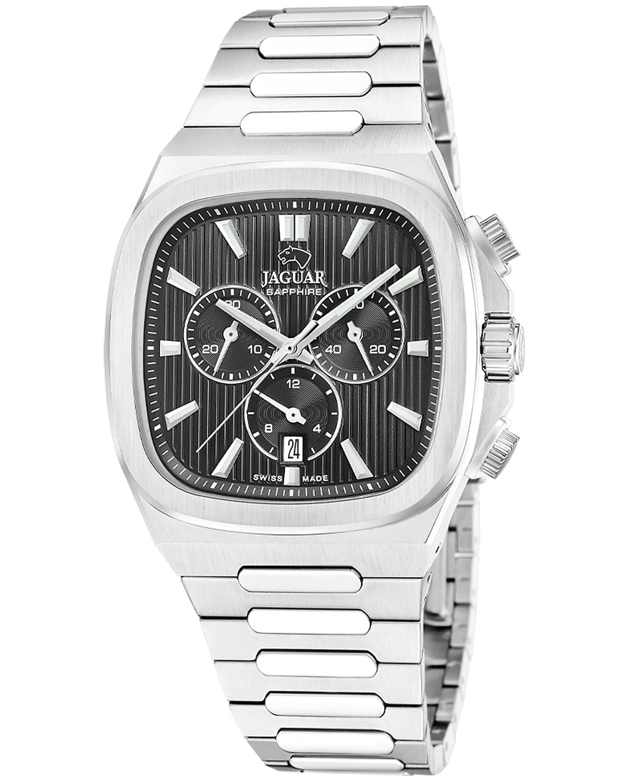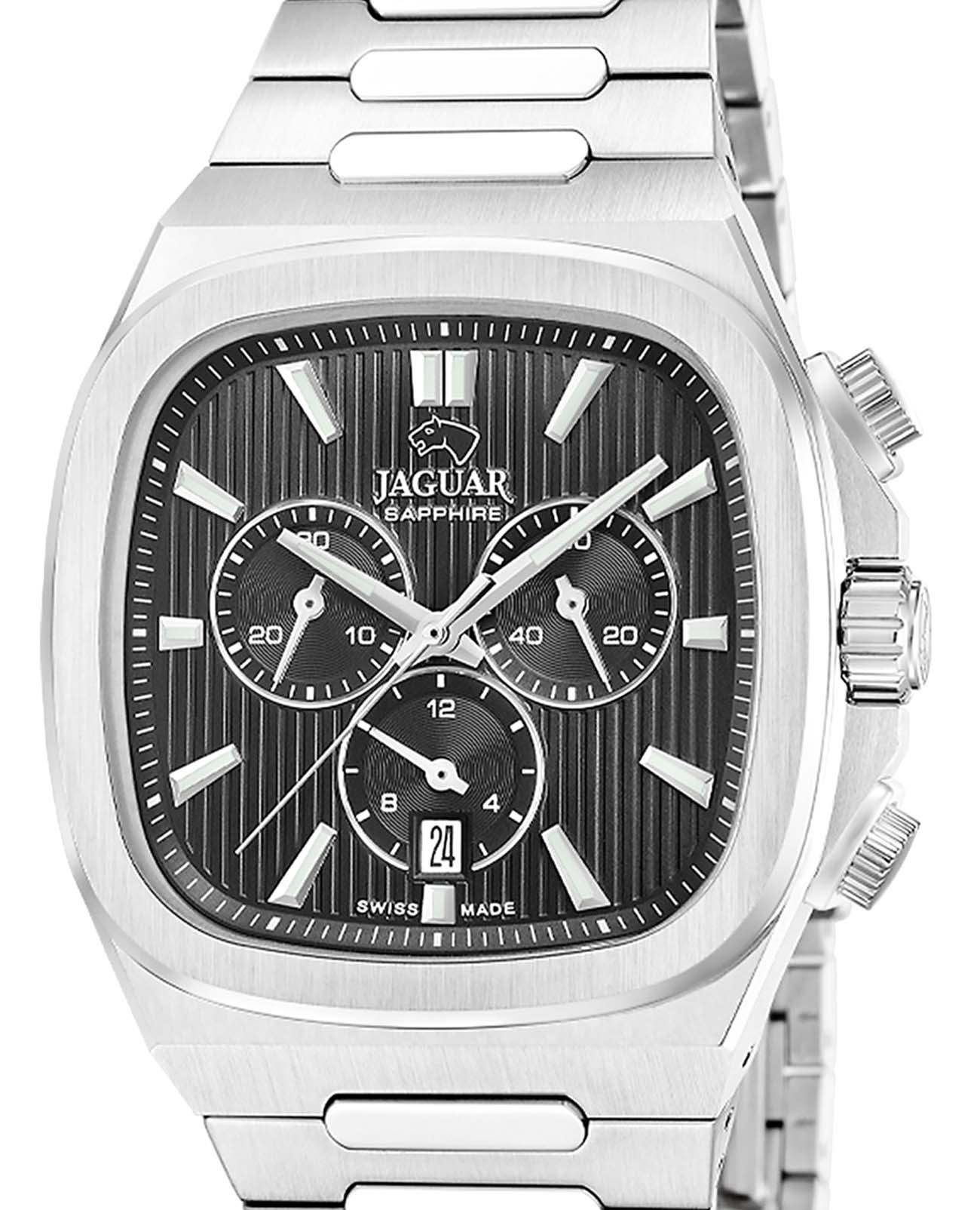 Мужские швейцарские часы Jaguar Rond Carre J1048/4  — это стильное сочетание элегантности и современного дизайна. Корпус из нержавеющей стали диаметром 43 мм идеально сбалансирован и элегантен. Сапфировое стеклоСапфировое стеклоПрочный и надёжный материал из кристалла сапфира синтетического происхождения, характеризующийся особой твёрдостью и устойчивостью к царапинам и повреждениям. с антибликовым покрытием защищает циферблат от царапин и обеспечивает отличную читаемость при любом освещении. Стальной браслет на застёжке-бабочке с кнопкамиЗастёжка "бабочка"Такой вид застёжки дополняется предохранителями, помогающими избежать случайного раскрытия браслета. Обладают изящным исполнением. идеально дополняют дизайн часов, обеспечивая комфортное ношение. Стрелки и метки на циферблате имеют люминесцентное покрытиеЛюминесцентное покрытиеПозволяет считывать показания времени в темноте. Производители наносят на стрелки, часовые индексы, безель или поверхность циферблата светонакопительный состав, дающий холодное свечение. позволяющее легко определять время даже в темноте. В часах есть функция хронографаХронографФункция позволяет измерять отрезки времени с особой точностью: часы, минуты, секунды. Верным признаком хронографа является наличие на циферблате 3 дополнительных окошек-счётчиков. с секундомеромСекундомерСекундоме́р — прибор, способный измерять интервалы времени с точностью до долей секунды., с помощью которой вы сможете измерять время с высокой точностью. Часы обладают водонепроницаемостью 50 метров, что позволит защитить корпус от случайных брызг или капель дождя.