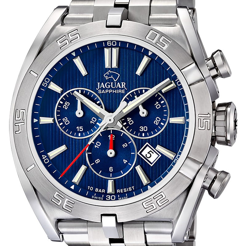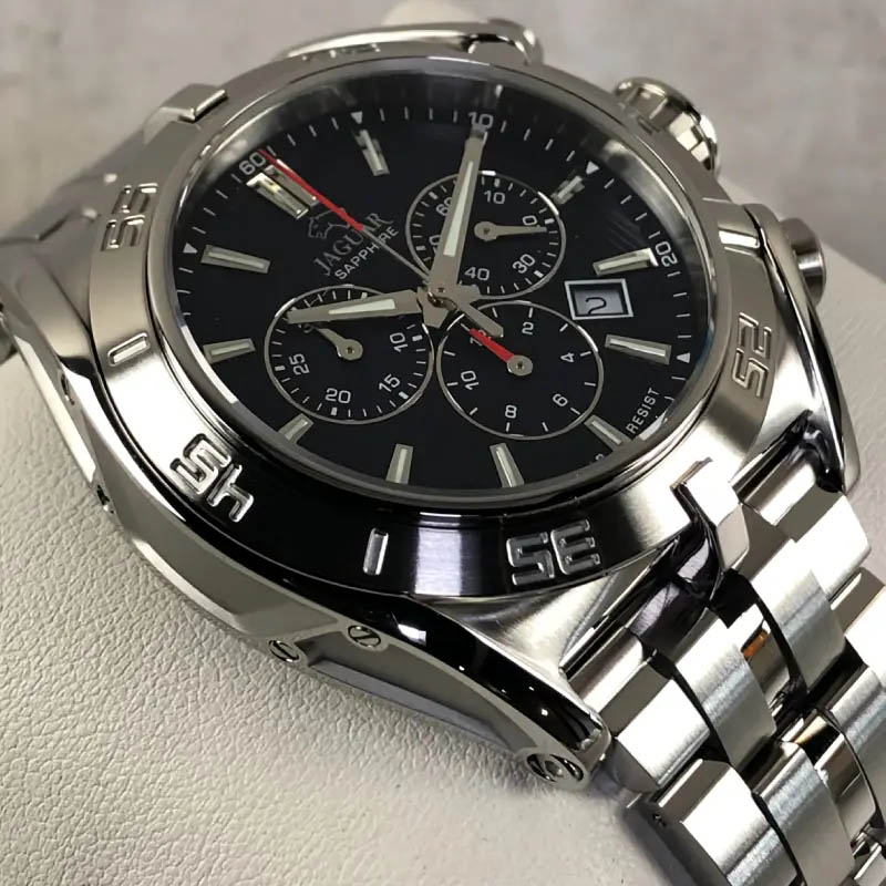 Мужские швейцарские часы-хронографХронографФункция позволяет измерять отрезки времени с особой точностью: часы, минуты, секунды. Верным признаком хронографа является наличие на циферблате 3 дополнительных окошек-счётчиков. Jaguar Executive J852/B. Кварцевый швейцарский калибр Ronda 5030d. Сапфировое стеклоСапфировое стеклоПрочный и надёжный материал из кристалла сапфира синтетического происхождения, характеризующийся особой твёрдостью и устойчивостью к царапинам и повреждениям. устойчивое к мелким механическим повреждениям. Корпус и браслет часов изготовлены из нержавеющей стали. Стрелки и метки с люминесцентным покрытиемЛюминесцентное покрытиеПозволяет считывать показания времени в темноте. Производители наносят на стрелки, часовые индексы, безель или поверхность циферблата светонакопительный состав, дающий холодное свечение.. Окошко даты находится в положении между «4» и «5 часами». Класс водозащиты: 100 метров, позволит плавать, нырять и заниматься другими водными видами спорта. Стальной браслет на раскладной застёжкеРаскладная застёжкаТакой тип застёжки используется только на браслетах из металла. Она никогда не раскрывается полностью, происходит разделение на 2 и более частей. Раскладывающая застёжка снизит вероятность потери часов к минимуму..