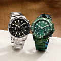 Стрелки и метки, покрытые люминесцентным составомЛюминесцентное покрытиеПозволяет считывать показания времени в темноте. Производители наносят на стрелки, часовые индексы, безель или поверхность циферблата светонакопительный состав, дающий холодное свечение., позволяют легко считывать время даже в условиях недостаточной освещённости. Календарь расположен в положении «8 часов». Водозащита на уровне 200 метров открывает возможность заниматься водными видами спорта.
