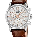 Jaguar J968/1 из коллекции Acamar — элегантные мужские часы, сочетающие швейцарское качество и современный дизайн. Корпус диаметром 42 мм выполнен из нержавеющей стали, что обеспечивает прочность и долговечность. Сапфировое стеклоСапфировое стеклоПрочный и надёжный материал из кристалла сапфира синтетического происхождения, характеризующийся особой твёрдостью и устойчивостью к царапинам и повреждениям. защищает циферблат от царапин и повреждений. Серебристый циферблат с розово-золотыми стрелками и индексами подчёркивает утончённый стиль. Часы оснащены хронографом с центральной секундной стрелкой (1/1 сек.), 30-минутным и 12-часовым счётчиками, а также функцией индикации даты, расположенной в окошке на отметке «4 часа». Ремешок из коричневой кожи обеспечивает комфортное ношение. Классическая застёжка гарантирует надёжную фиксацию. Водозащита до 5 ATM (50 метров) делает часы подходящими для повседневного использования. Jaguar J968/1 — это идеальный выбор для мужчин, которые ценят классический дизайн, функциональность и швейцарское качество.