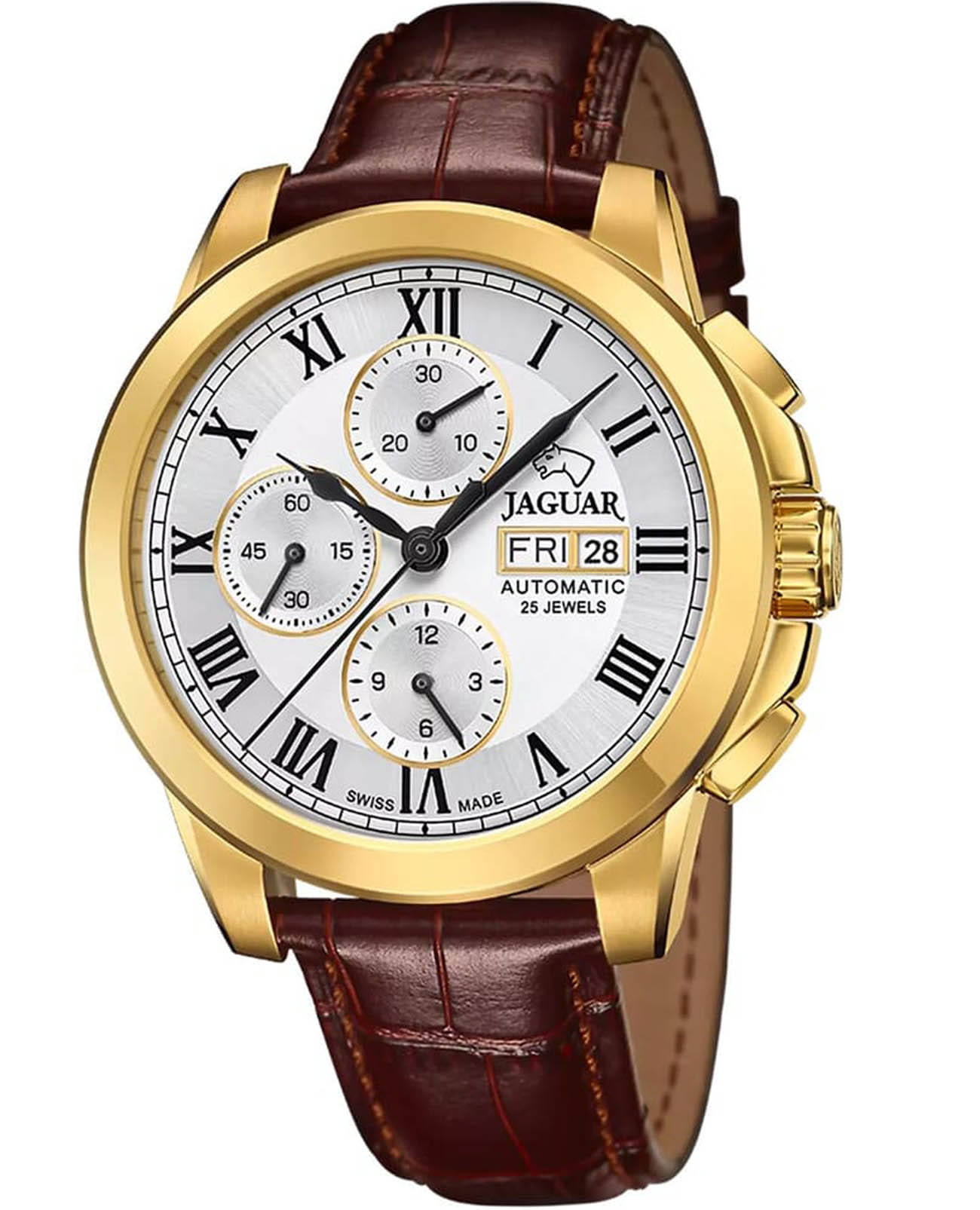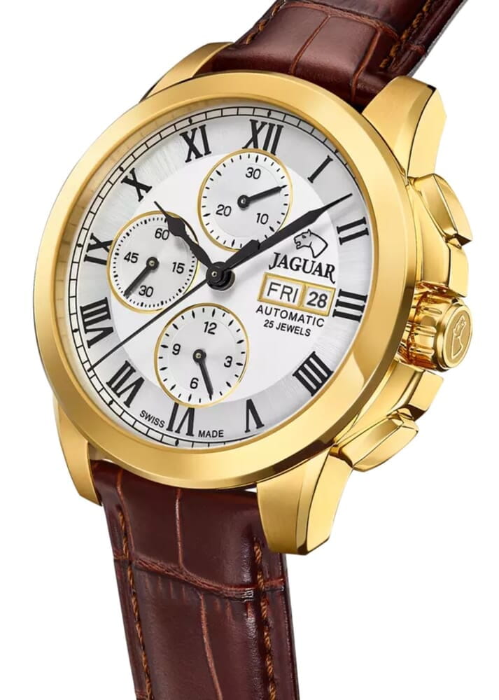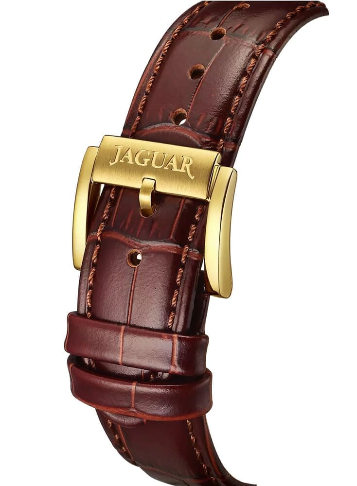 Jaguar Le Chronographe J976/1  — это мужские часы, сочетающие классический дизайн с современными функциями. Корпус диаметром 45 мм выполнен из нержавеющей стали с PVD-покрытиемPVDУльтратонкое покрытие наносится в технике вакуумного напыления, сочетает в себе нитрид титана особой прочности со слоем золота или оксида хрома. Несёт в себе декоративную или защитную функцию., что обеспечивает прочность и элегантный внешний вид. Сапфировое стеклоСапфировое стеклоПрочный и надёжный материал из кристалла сапфира синтетического происхождения, характеризующийся особой твёрдостью и устойчивостью к царапинам и повреждениям. защищает циферблат от царапин и повреждений. Изысканный циферблат со стильными индексами и стрелками подчёркивает утончённый стиль. Часы с хронографом. Часы оснащены стильным кожаным ремешком и классической застежкой, идеальной системой крепления для кожаного ремешка, которая гарантирует, что часы будут надежно оставаться на месте в любое время. Водозащита до 10 ATM (100 метров) делает часы подходящими для плавания и занятий водными видами спорта. Jaguar J976/1 — идеальный выбор для мужчин, которые ценят швейцарское качество и современные технологии.