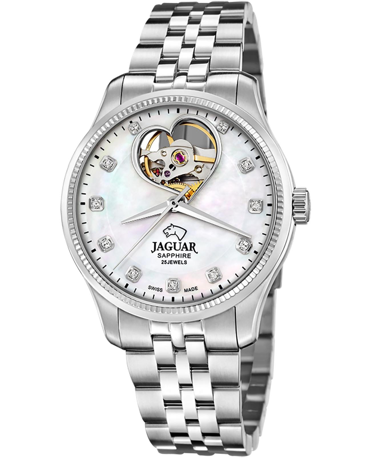 Женские швейцарские часы JAGUAR Automatic Open Heart J994/1, механизм — автоподзавод. В часах с автоподзаводом заводная головка практически не используется, что исключает истирание ее материала и материала корпуса. Сапфировое стеклоСапфировое стеклоПрочный и надёжный материал из кристалла сапфира синтетического происхождения, характеризующийся особой твёрдостью и устойчивостью к царапинам и повреждениям. устойчивое к мелким механическим повреждениям. Корпус и браслет часов изготовлены из нержавеющей стали. Класс водозащиты: 50 метров, позволит защитить корпус от случайных брызг или капель дождя. Стальной браслет на застёжке-бабочке с кнопкамиЗастёжка "бабочка"Такой вид застёжки дополняется предохранителями, помогающими избежать случайного раскрытия браслета. Обладают изящным исполнением. . Циферблат украшен кристаллами в роли часовых индексов, крупная апертура в виде сердца, открывающая обзор на балансовое колесо механизма.