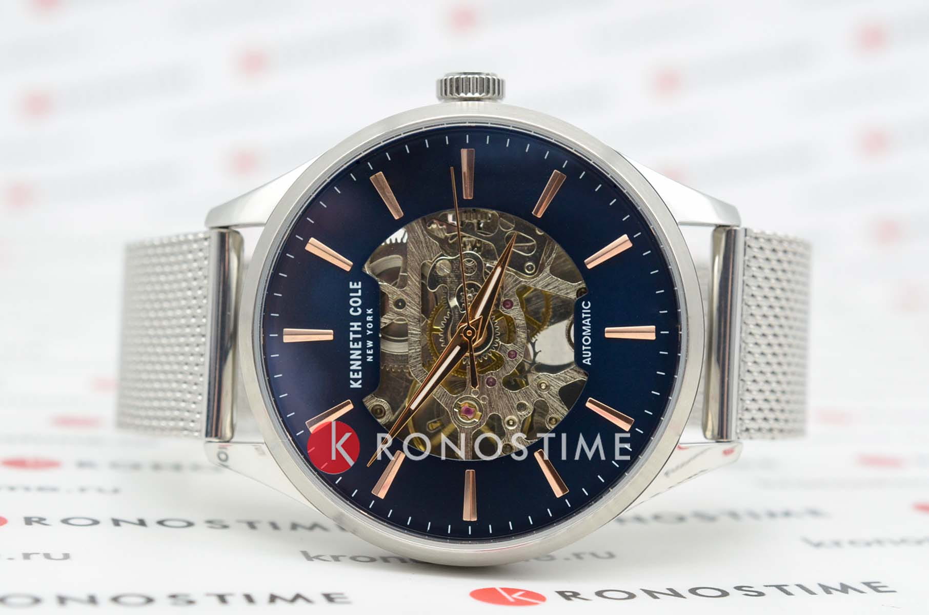 Мужские механические часы-скелетоны с минеральным стекломМинеральное стеклоМинеральное стекло представляет собой искусственно выращенный минерал кварца. Такое стекло отличается особой устойчивостью к повреждениям и царапинам. Уступает по некоторым качествам сапфировому стеклу. Kenneth Cole Automatic KCWGL2216905, механический механизм (автоматический калибр) с высокой точностью. Корпус часов изготовлен из стали. Стрелки с люминесцентным покрытиемЛюминесцентное покрытиеПозволяет считывать показания времени в темноте. Производители наносят на стрелки, часовые индексы, безель или поверхность циферблата светонакопительный состав, дающий холодное свечение.. Класс водозащиты: 30 метров, позволит защитить корпус от случайных брызг или капель дождя. Стальной браслет миланского плетения на раскладном замкеРаскладной замокДанный вариант застежки используется только на часах с металлическим браслетом. Отличительная особенность такого крепления в том, что длина браслета становится универсальной и вы можете самостоятельно отрегулировать нужный вам размер – застежка просто двигается по браслету часов..