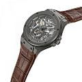 Kenneth Cole KCWGX0080801 — мужская механическая модель с мощным дизайном и открытым скелетонизированным циферблатом. Круглый корпус из нержавеющей стали выполнен с тёмным PVDPVDУльтратонкое покрытие наносится в технике вакуумного напыления, сочетает в себе нитрид титана особой прочности со слоем золота или оксида хрома. Несёт в себе декоративную или защитную функцию.-покрытием и декорирован винтами на безелеБезельВнешний ободок, закрепляющий стекло. В спортивных часах так называется поворотное кольцо с делениями на циферблате, выполняет роль таймера – замеряет отрезки времени на шкале. Неподвижный безель – элемент декора. Однонаправленно вращающийся безель на дайверских часах позволяет фиксировать моменты погружения и выныривания на поверхность., что подчёркивает индустриальный характер часов. Циферблат открывает вид на работу механизма, создавая эффект глубины и технической изысканности. Метки и стрелки покрыты люминесцентным покрытиемЛюминесцентное покрытиеПозволяет считывать показания времени в темноте. Производители наносят на стрелки, часовые индексы, безель или поверхность циферблата светонакопительный состав, дающий холодное свечение., обеспечивающим читаемость даже в условиях слабого освещения. Защитную функцию выполняет минеральное стеклоМинеральное стеклоМинеральное стекло представляет собой искусственно выращенный минерал кварца. Такое стекло отличается особой устойчивостью к повреждениям и царапинам. Уступает по некоторым качествам сапфировому стеклу., стойкое к повседневным повреждениям. Часы комплектуются кожаным ремешком с классической застёжкой, который обеспечивает комфорт и стильное сочетание с массивным корпусом. Модель объединяет выразительный скелетон-дизайн и современный характер, становясь эффектным акцентом в мужском образе.