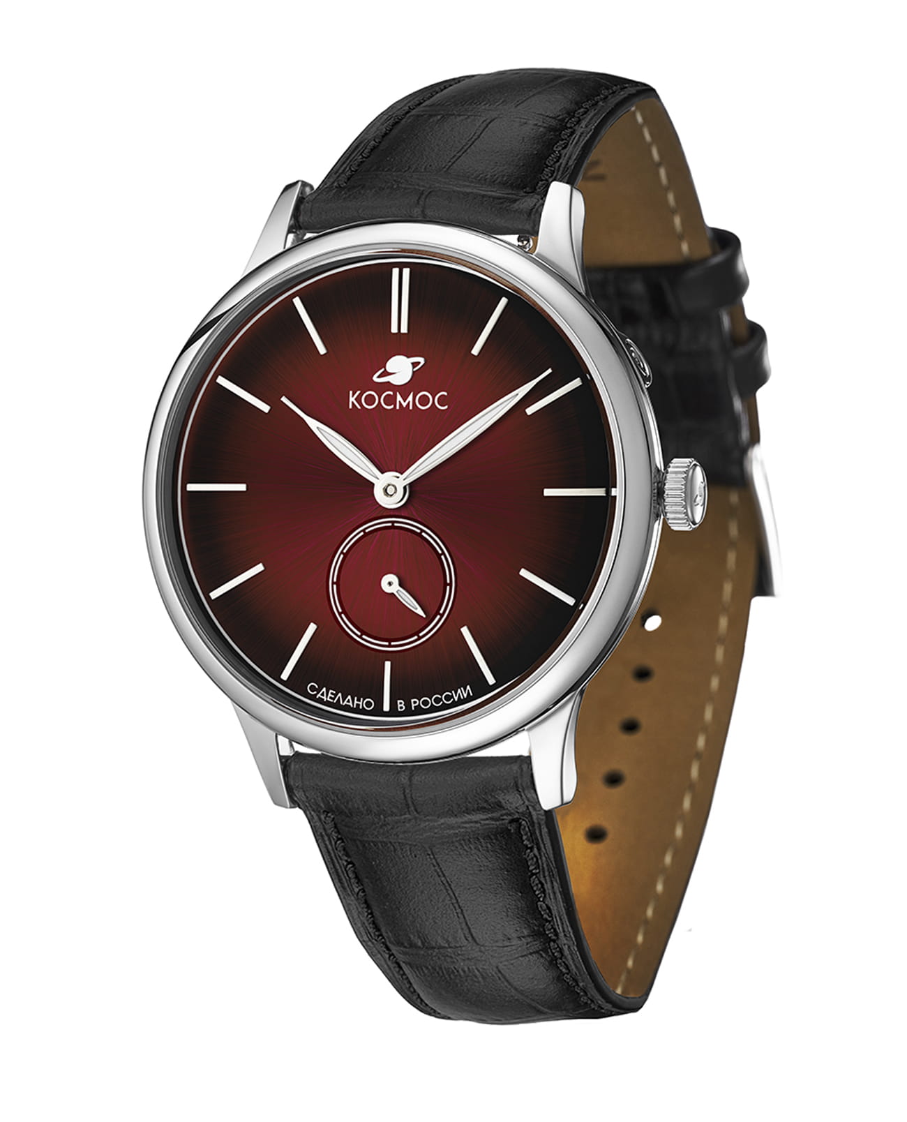 Мужские наручные часы Космос Сириус К 021.11.35 — это сочетание традиций часового искусства 60-70-х годов и футуристического дизайна, вдохновленного космическими исследованиями. Они не только служат напоминанием о прошлом, но и побуждают задуматься о будущем, позволяя наслаждаться качеством и смыслом, вложенными в каждую деталь. Полированный корпус часов выполнен в виде силуэта летающей тарелки благодаря выпуклым формам стекла и нижней части корпуса. Стальные ушки, которые напоминают опоры летающей тарелки, завершает общий образ. На задней крышке часов выгравирован фантазийный сюжет – космическая станция будущего. Бордовый циферблат в ретро-стиле с выгнутыми краями требует сложной технологии производства, что делает их аналогами часов прошлых эпох. Кончик секундной стрелки изогнут так, чтобы гармонировать с формой циферблата. Выпуклый градиентный циферблат украшен шлифовкой, напоминающей солнечные лучи, и ручными индексами, надежно закрепленными на двух штифтах. Специальное люминесцентное покрытиеЛюминесцентное покрытиеПозволяет считывать показания времени в темноте. Производители наносят на стрелки, часовые индексы, безель или поверхность циферблата светонакопительный состав, дающий холодное свечение. нанесено на часовую, минутную и секундную стрелки, а также на пунктирные метки и окантовку циферблата, создавая эффект светящегося изображения в темноте. Форма минерального стеклаМинеральное стеклоМинеральное стекло представляет собой искусственно выращенный минерал кварца. Такое стекло отличается особой устойчивостью к повреждениям и царапинам. Уступает по некоторым качествам сапфировому стеклу. также тщательно продумана — оно изогнуто как снаружи, так и изнутри. Эта конструкция предотвращает искажение изображения на циферблате, в отличие от традиционных стекол с прямой внутренней частью, которые могут создавать оптические искажения. Часы комплектуются кожаным браслетом черного цвета с прошивкой. Корпус изготовлен из гипоаллергенной стали, что обеспечивает комфорт при ношении. Заводная головка, застежка и ремешок украшены фирменным логотипом, подчеркивающим индивидуальность данной модели.