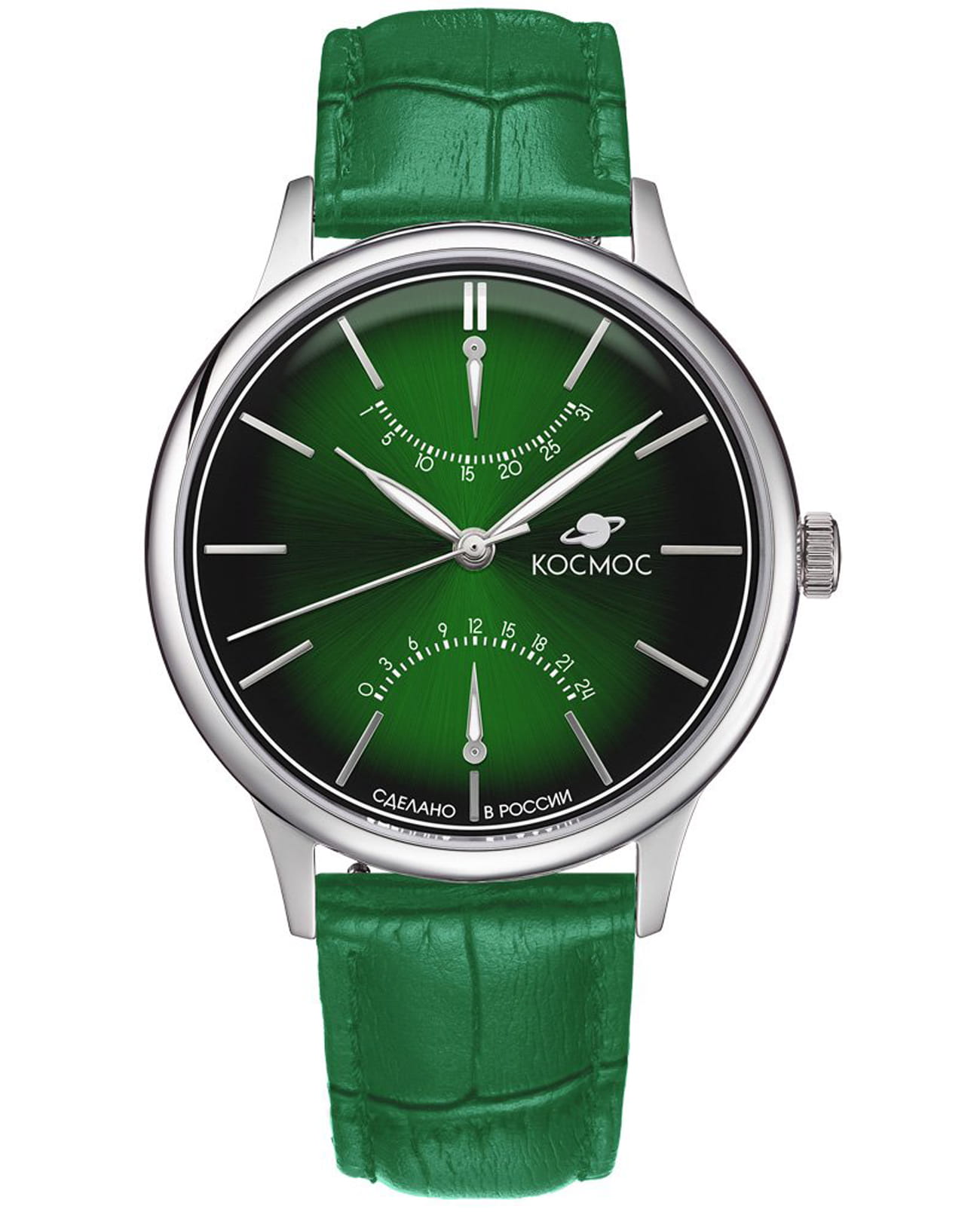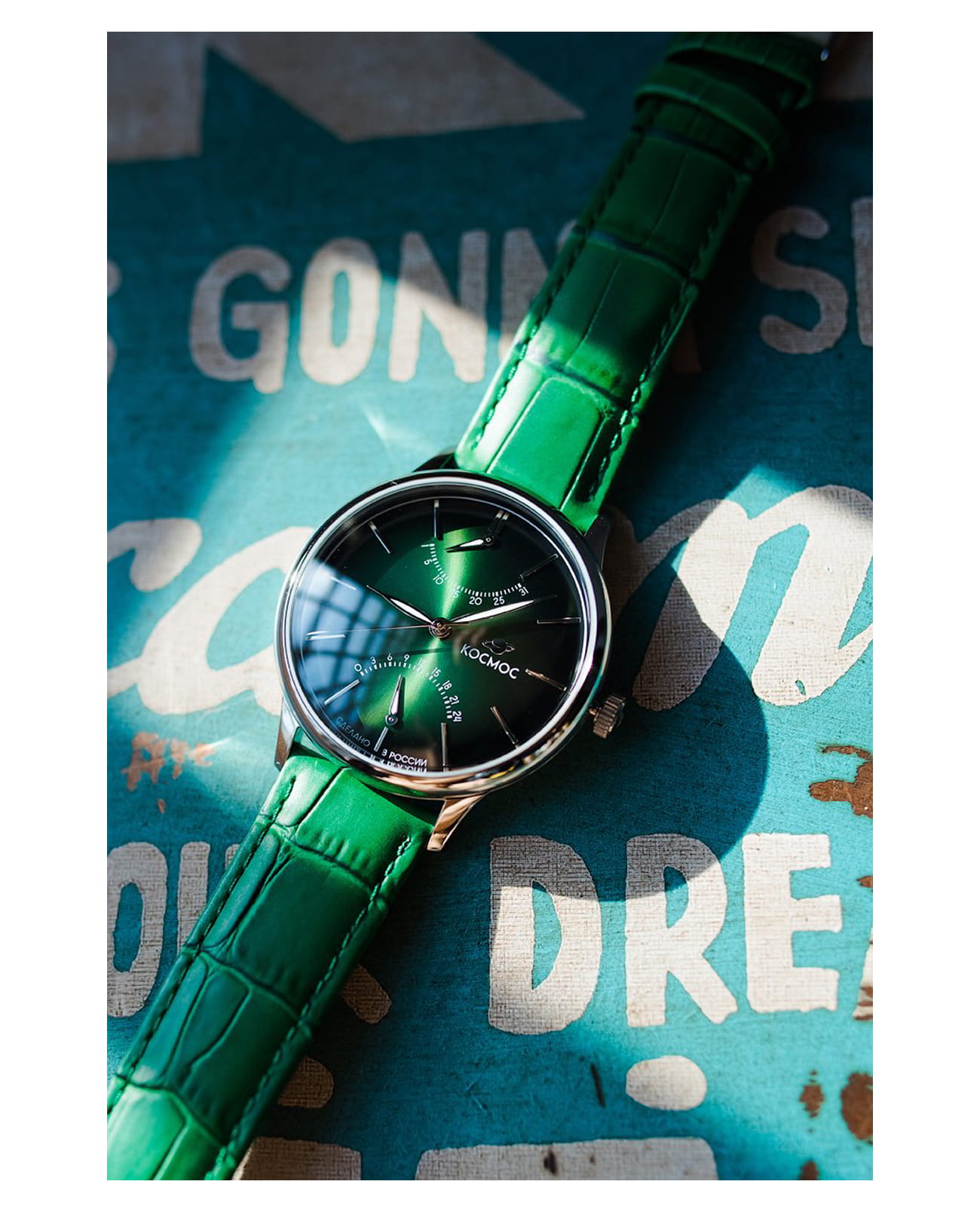 Мужские наручные часы Космос Космопорт K 058.17.38 — это сочетание традиций часового искусства 60-70-х годов и футуристического дизайна, вдохновленного космическими исследованиями. Они не только служат напоминанием о прошлом, но и побуждают задуматься о будущем, позволяя наслаждаться качеством и смыслом, вложенными в каждую деталь. Полированный корпус часов выполнен в виде силуэта летающей тарелки благодаря выпуклым формам стекла и нижней части корпуса. Стальные ушки, которые напоминают опоры летающей тарелки, завершает общий образ. На задней крышке часов выгравирован фантазийный сюжет – космическая станция будущего. Циферблат зеленого цвета выполнен в ретро стиле с закруглёнными краями, что требует применения сложной технологии производства, характерной для часов прошлых лет. Кончик секундной стрелки повторяет эту форму, а на выпуклом градиентном циферблате выполнена шлифовка, напоминающая солнечные лучи. Индексы, изготовленные вручную и закрепленные на двух штифтах, добавляют изысканности. Также присутствуют ретроградные индикаторы даты и второго времени (24 часа), которые возвращаются в исходное положение одним движением.  Люминесцентное покрытиеЛюминесцентное покрытиеПозволяет считывать показания времени в темноте. Производители наносят на стрелки, часовые индексы, безель или поверхность циферблата светонакопительный состав, дающий холодное свечение. на часовой и минутной стрелках, а также на стрелках ретроградных индикаторов и окантовке циферблата создает эффект светящегося ореола в темноте. Форма минерального стеклаМинеральное стеклоМинеральное стекло представляет собой искусственно выращенный минерал кварца. Такое стекло отличается особой устойчивостью к повреждениям и царапинам. Уступает по некоторым качествам сапфировому стеклу., представляющего собой двояковыпуклую конструкцию, тщательно проработана. Такое стекло не искажает изображение на циферблате, потому что внутренняя поверхность остаётся плоской, создавая эффект линзы. Производственный процесс для достижения двух параллельно изогнутых поверхностей очень сложен, и требуется высокая точность, чтобы избежать повреждения стекла. Ремешок из зеленой натуральной кожи оснащён креплениями, которые позволяют легко снимать и надевать его без использования дополнительных инструментов. Заводная головка, застежка и ремешок украшены фирменным логотипом, что подчеркивает индивидуальность и стиль этих часов.