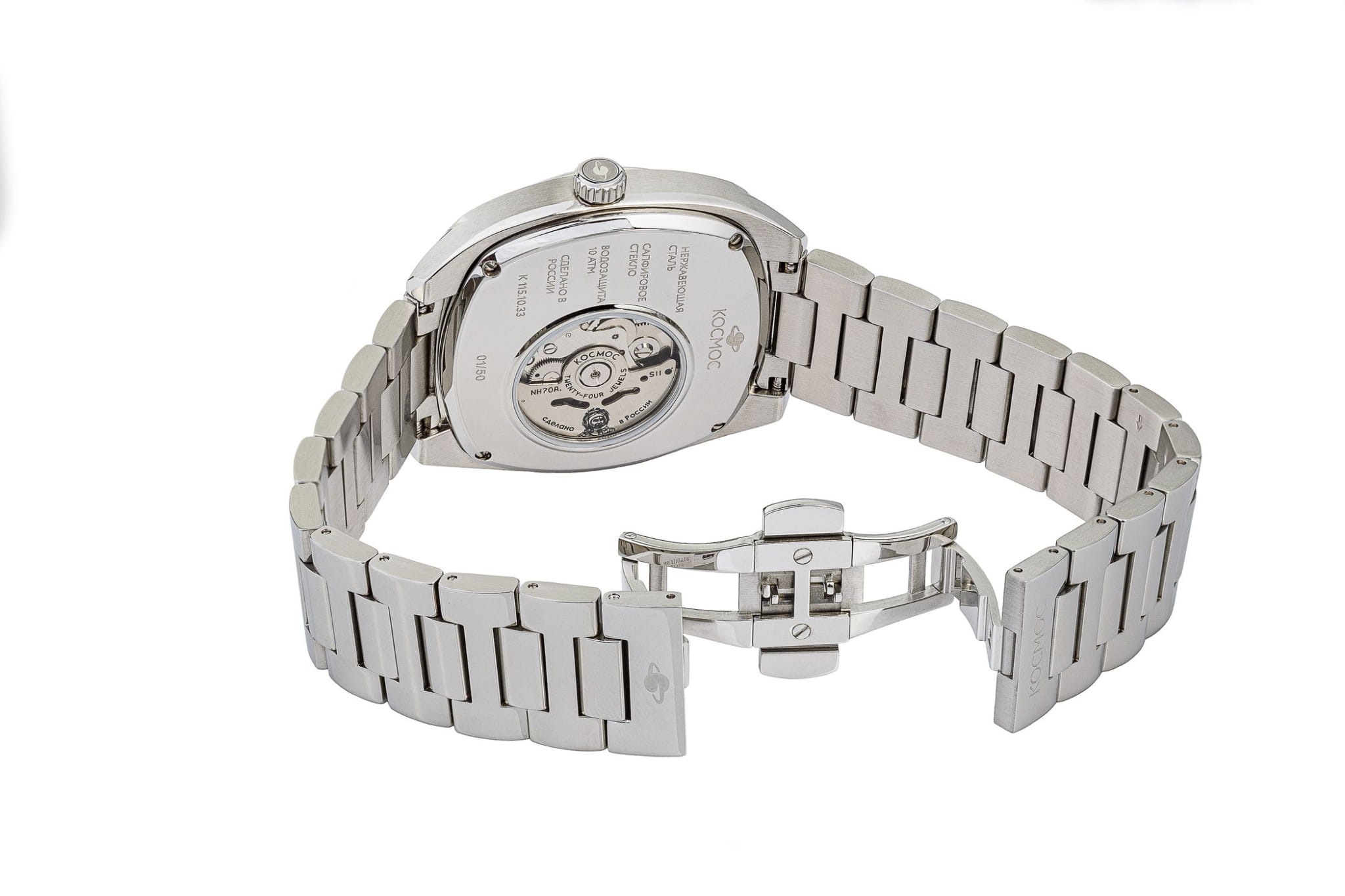 Мужские наручные часы Космос Спутник K 115.10.34 — это уникальная лимитированная серия, созданная в честь исторического запуска первого искусственного спутника Земли. В корпусе необычной круглой формы, выполненном из гипоаллергенной нержавеющей стали 316L, работает надежный механический механизм с автоподзаводом от японской компании Seiko. Прозрачная задняя крышка, закрепленная на четырех винтах, открывает вид на сложный механизм, а на самой крышке указан индивидуальный номер модели в формате хх/50. Скелетонизированный черный циферблат защищен сапфировым стекломСапфировое стеклоПрочный и надёжный материал из кристалла сапфира синтетического происхождения, характеризующийся особой твёрдостью и устойчивостью к царапинам и повреждениям. с антибликовым покрытием, которое обеспечивает максимальную устойчивость к царапинам и идеальную видимость в любых условиях. Украшением циферблата служат крупные стрелки с люминесцентным покрытиемЛюминесцентное покрытиеПозволяет считывать показания времени в темноте. Производители наносят на стрелки, часовые индексы, безель или поверхность циферблата светонакопительный состав, дающий холодное свечение., а также специальная апертура, окаймленная элементами, напоминающими антенны Спутника. Часовая и минутная стрелки отлично читаются благодаря своему размеру и светящемуся покрытию. Браслет литой конструкции из нержавеющей стали дополнен удобной застежкой-бабочкой с двумя боковыми кнопкамиЗастёжка "бабочка"Такой вид застёжки дополняется предохранителями, помогающими избежать случайного раскрытия браслета. Обладают изящным исполнением. , что гарантирует надежную фиксацию на руке. Водозащита до 10 атм (WR100) позволяет использовать часы при плавании и других водных видах спорта без акваланга. Коллекция Спутник — это выбор для ценителей истории космических достижений и современных технологий.