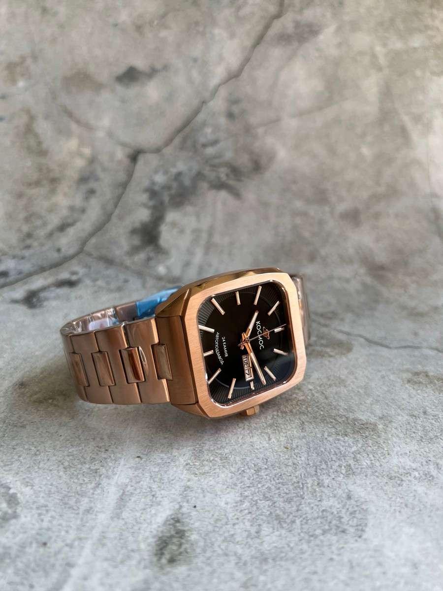 Мужские наручные часы Космос Марсоход K 213.40.31 — это уникальная лимитированная серия, посвященная аппарату, способному передвигаться по поверхности Красной планеты. Марсоход ассоциируется с брутальностью, мастерством и технической сложностью. Наша страна дважды запускала подобные аппараты еще в 70-х годах прошлого века. Дизайн часов серии Марсоход вдохновлен лучшими работами советских мастеров, сочетая современные технологии часового искусства с обаянием стиля ретро. Корпус в форме квадрата с закругленными углами выполнен из нержавеющей стали с PVDPVDУльтратонкое покрытие наносится в технике вакуумного напыления, сочетает в себе нитрид титана особой прочности со слоем золота или оксида хрома. Несёт в себе декоративную или защитную функцию. покрытием, украшенной зеркальной полировкой и сатинированием. Удобная заводная головка имеет форму гайки, что добавляет модели индустриальный шарм. Задняя крышка прозрачная, закрепленная на четырех винтах, и позволяет увидеть работу механизма TMI с подвижным ротором, на котором гравируется надпись «Сделано в России». Также здесь представлена гравировка с изображением космонавта, придающая часам особую значимость. Водостойкость достигает 10 атм (WR100), что позволяет использовать часы при плавании и других водных видах спорта. На задней крышке указан индивидуальный номер модели в формате от 01/50 до 50/50 (первый выпуск) или от 051/200 до 200/200 (второй выпуск). Объемный циферблат состоит из двух уровней. В центре движутся три стрелки, часовая и минутная из которых имеют люминесцентное покрытиеЛюминесцентное покрытиеПозволяет считывать показания времени в темноте. Производители наносят на стрелки, часовые индексы, безель или поверхность циферблата светонакопительный состав, дающий холодное свечение., позволяющее определять время даже в темноте. Индексы накладные, как и стальная рамка, выделяющая сдвоенное окошко даты и дня недели, где день недели отображается на двух языках — русском и английском. Циферблат защищен прочным сапфировым стеклом с антибликовым покрытиемСапфировое стеклоПрочный и надёжный материал из кристалла сапфира синтетического происхождения, характеризующийся особой твёрдостью и устойчивостью к царапинам и повреждениям., обеспечивающим отличную читаемость показаний в любых условиях. Браслет изготовлен из литых стальных звеньев нержавеющей стали и оснащен удобной застёжкой «бабочка» с кнопкамиЗастёжка "бабочка"Такой вид застёжки дополняется предохранителями, помогающими избежать случайного раскрытия браслета. Обладают изящным исполнением. , которая сводит к минимуму вероятность потери. Заводная головка, застежка и браслет украшены фирменным логотипом бренда. Коллекция Марсоход — идеальный выбор для ценителей истории космических достижений и современных технологий.