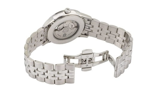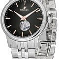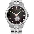 Мужские наручные часы Космос Телескоп K 304.10.34 —  это уникальная лимитированная серия под названием Телескоп, посвящена аппарату приоткрывающего взгляду бескрайние дали космического пространства. Апертура открытого баланса модели по форме напоминает круглую линзу телескопа. Сквозь это окошко, расположенное на черном циферблате, также можно увидеть много интересного: ту самую систему «баланс-спираль» автоматического механизма, которая отвечает за точность хода. Корпус часов выполнен из нержавеющей стали, классической круглой формы и достаточно тонкий для механических моделей. Это стало возможным благодаря использованию механизма Miyota, калибр 9029, с высотой всего 3.9 мм. Циферблат декорирован вертикальной текстурой в ретро-стиле, по которой движутся крупные часовая и минутная стрелки, имеющие люминесцентное покрытиеЛюминесцентное покрытиеПозволяет считывать показания времени в темноте. Производители наносят на стрелки, часовые индексы, безель или поверхность циферблата светонакопительный состав, дающий холодное свечение., позволяющее определять время даже в темноте. Циферблат защищен прочным сапфировым стеклом с антибликовым покрытиемСапфировое стеклоПрочный и надёжный материал из кристалла сапфира синтетического происхождения, характеризующийся особой твёрдостью и устойчивостью к царапинам и повреждениям., обеспечивающим отличную читаемость показаний в любых условиях. Прозрачная задняя крышка, закрепленная на четырех винтах, демонстрирует механизм и содержит выгравированный индивидуальный номер экземпляра  хх/50, отражающий лимитированный тираж всего в 50 штук. Браслет изготовлен из нержавеющей стали и оснащен удобной застёжкой «бабочка» с кнопкамиЗастёжка "бабочка"Такой вид застёжки дополняется предохранителями, помогающими избежать случайного раскрытия браслета. Обладают изящным исполнением. , которая сводит к минимуму вероятность потери. Модель Телескоп сочетает классический дизайн и универсальность, прекрасно подходя как к деловому костюму, так и к более повседневным образам.