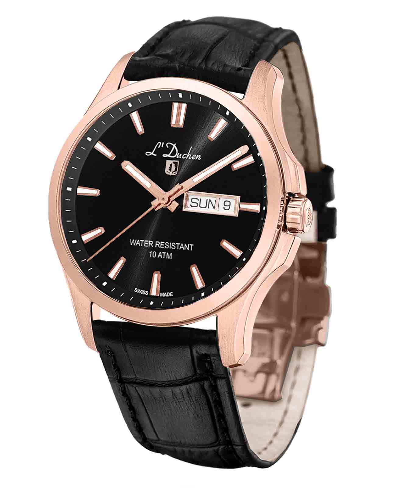 Мужские швейцарские часы L'Duchen Dynamique D 261.40.36, кварцевый механизм с высокой точностью. Сапфировое стеклоСапфировое стеклоПрочный и надёжный материал из кристалла сапфира синтетического происхождения, характеризующийся особой твёрдостью и устойчивостью к царапинам и повреждениям. устойчивое к появлению царапин, обладающее высокой прозрачностью. Корпус часов выполнен из нержавеющей стали с PVD-покрытиемPVDУльтратонкое покрытие наносится в технике вакуумного напыления, сочетает в себе нитрид титана особой прочности со слоем золота или оксида хрома. Несёт в себе декоративную или защитную функцию.. Стрелки с люминесцентным покрытиемЛюминесцентное покрытиеПозволяет считывать показания времени в темноте. Производители наносят на стрелки, часовые индексы, безель или поверхность циферблата светонакопительный состав, дающий холодное свечение.. Окошко даты находится в положении 3 часа. Класс водозащиты: 100 метров, позволит плавать, нырять и заниматься другими водными видами спорта. Кожаный ремешок на застёжке «бабочка» с кнопкамиЗастёжка "бабочка"Такой вид застёжки дополняется предохранителями, помогающими избежать случайного раскрытия браслета. Обладают изящным исполнением. .