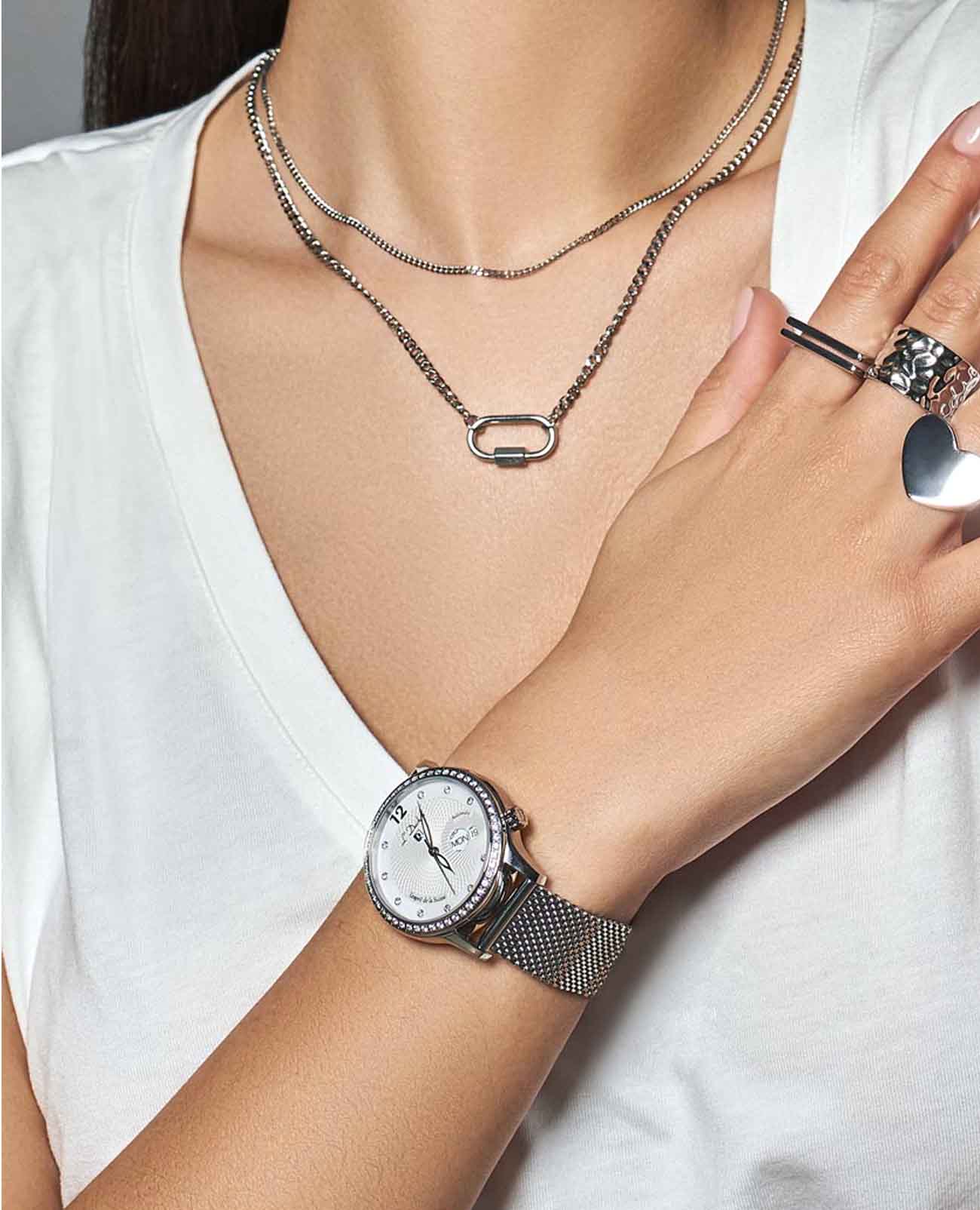 Женские швейцарские механические часы с автоподзаводом L'Duchen Coquille D 713.16.33 M. Сапфировое стеклоСапфировое стеклоПрочный и надёжный материал из кристалла сапфира синтетического происхождения, характеризующийся особой твёрдостью и устойчивостью к царапинам и повреждениям. устойчивое к появлению царапин, обладающее высокой прозрачностью. Корпус часов выполнен из нержавеющей стали. БезельБезельВнешний ободок, закрепляющий стекло. В спортивных часах так называется поворотное кольцо с делениями на циферблате, выполняет роль таймера – замеряет отрезки времени на шкале. Неподвижный безель – элемент декора. Однонаправленно вращающийся безель на дайверских часах позволяет фиксировать моменты погружения и выныривания на поверхность. и циферблат украшены фианитами. Стрелки с люминесцентным покрытиемЛюминесцентное покрытиеПозволяет считывать показания времени в темноте. Производители наносят на стрелки, часовые индексы, безель или поверхность циферблата светонакопительный состав, дающий холодное свечение.. Класс водозащиты: 50 метров, позволит защитить корпус от случайных брызг или капель дождя. Стальной браслет миланского плетения на раскладном замкеРаскладной замокДанный вариант застежки используется только на часах с металлическим браслетом. Отличительная особенность такого крепления в том, что длина браслета становится универсальной и вы можете самостоятельно отрегулировать нужный вам размер – застежка просто двигается по браслету часов..