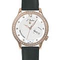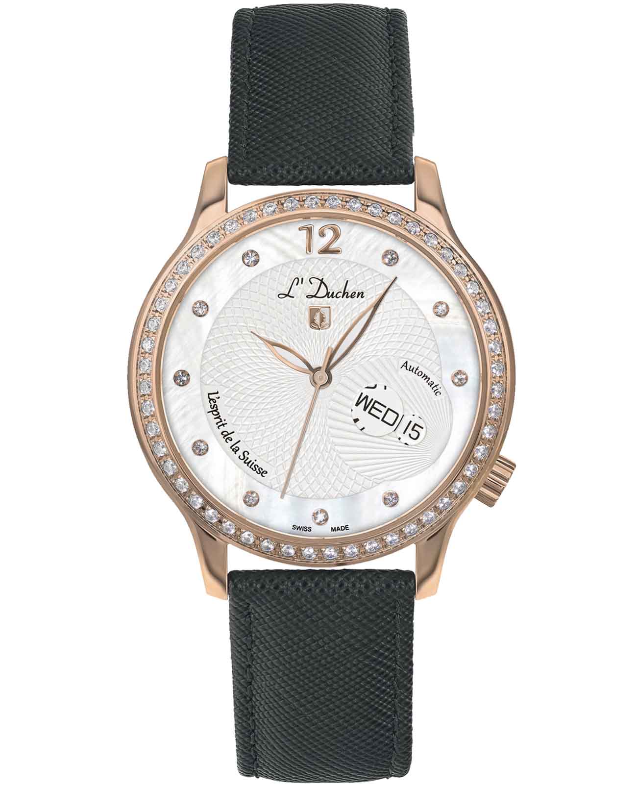Женские швейцарские механические часы с автоподзаводом L'Duchen Coquille D 713.41.31. Сапфировое стеклоСапфировое стеклоПрочный и надёжный материал из кристалла сапфира синтетического происхождения, характеризующийся особой твёрдостью и устойчивостью к царапинам и повреждениям. устойчивое к появлению царапин, обладающее высокой прозрачностью. Корпус часов выполнен из нержавеющей стали с PVD-покрытиемPVDУльтратонкое покрытие наносится в технике вакуумного напыления, сочетает в себе нитрид титана особой прочности со слоем золота или оксида хрома. Несёт в себе декоративную или защитную функцию.. БезельБезельВнешний ободок, закрепляющий стекло. В спортивных часах так называется поворотное кольцо с делениями на циферблате, выполняет роль таймера – замеряет отрезки времени на шкале. Неподвижный безель – элемент декора. Однонаправленно вращающийся безель на дайверских часах позволяет фиксировать моменты погружения и выныривания на поверхность. и циферблат украшены фианитами. Стрелки с люминесцентным покрытиемЛюминесцентное покрытиеПозволяет считывать показания времени в темноте. Производители наносят на стрелки, часовые индексы, безель или поверхность циферблата светонакопительный состав, дающий холодное свечение.. Класс водозащиты: 50 метров, позволит защитить корпус от случайных брызг или капель дождя. Кожаный ремешок на застёжке «бабочка» с кнопкамиЗастёжка "бабочка"Такой вид застёжки дополняется предохранителями, помогающими избежать случайного раскрытия браслета. Обладают изящным исполнением. .