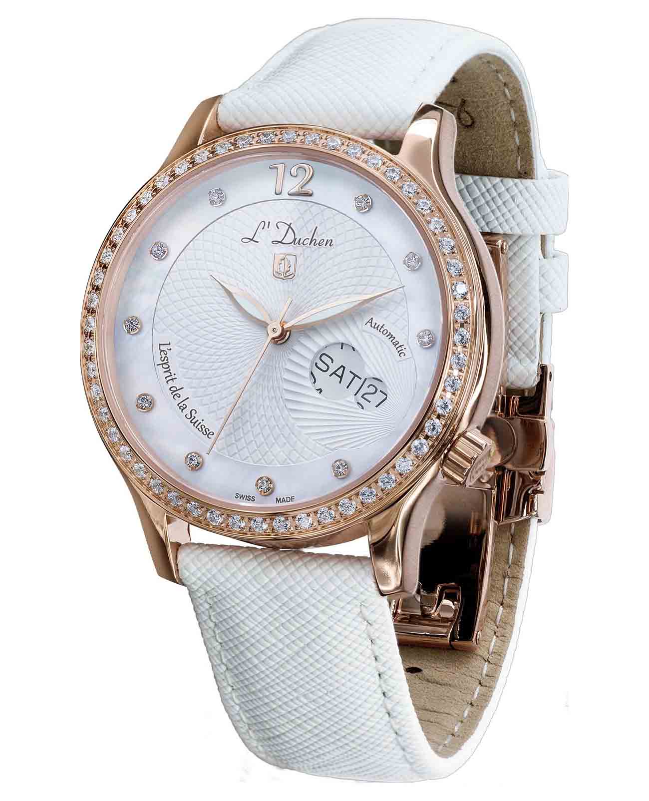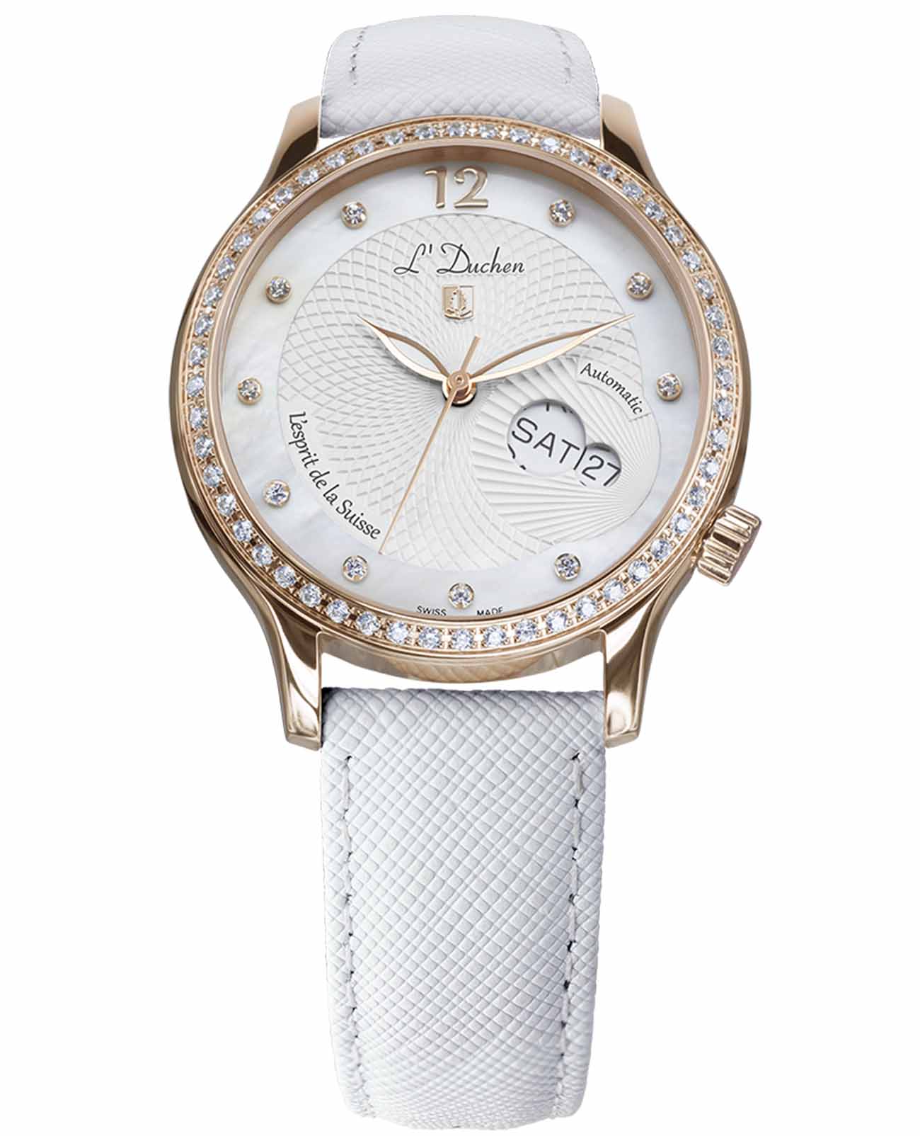 Женские швейцарские механические часы с автоподзаводом L'Duchen Coquille D 713.46.33. Сапфировое стеклоСапфировое стеклоПрочный и надёжный материал из кристалла сапфира синтетического происхождения, характеризующийся особой твёрдостью и устойчивостью к царапинам и повреждениям. устойчивое к появлению царапин, обладающее высокой прозрачностью. Корпус часов выполнен из нержавеющей стали с PVD-покрытиемPVDУльтратонкое покрытие наносится в технике вакуумного напыления, сочетает в себе нитрид титана особой прочности со слоем золота или оксида хрома. Несёт в себе декоративную или защитную функцию.. БезельБезельВнешний ободок, закрепляющий стекло. В спортивных часах так называется поворотное кольцо с делениями на циферблате, выполняет роль таймера – замеряет отрезки времени на шкале. Неподвижный безель – элемент декора. Однонаправленно вращающийся безель на дайверских часах позволяет фиксировать моменты погружения и выныривания на поверхность. и циферблат украшены фианитами. Стрелки с люминесцентным покрытиемЛюминесцентное покрытиеПозволяет считывать показания времени в темноте. Производители наносят на стрелки, часовые индексы, безель или поверхность циферблата светонакопительный состав, дающий холодное свечение.. Класс водозащиты: 50 метров, позволит защитить корпус от случайных брызг или капель дождя. Кожаный ремешок на застёжке «бабочка» с кнопкамиЗастёжка "бабочка"Такой вид застёжки дополняется предохранителями, помогающими избежать случайного раскрытия браслета. Обладают изящным исполнением. .