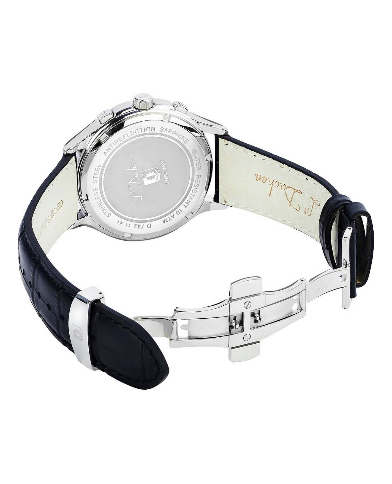 Мужские швейцарские часы- хронографХронографФункция позволяет измерять отрезки времени с особой точностью: часы, минуты, секунды. Верным признаком хронографа является наличие на циферблате 3 дополнительных окошек-счётчиков. L'Duchen Pilotage D 742.11.45, кварцевый механизм с высокой точностью. Сапфировое стеклоСапфировое стеклоПрочный и надёжный материал из кристалла сапфира синтетического происхождения, характеризующийся особой твёрдостью и устойчивостью к царапинам и повреждениям. устойчивое к появлению царапин, обладающее высокой прозрачностью. Корпус часов выполнен из нержавеющей стали. Стрелки с люминесцентным покрытиемЛюминесцентное покрытиеПозволяет считывать показания времени в темноте. Производители наносят на стрелки, часовые индексы, безель или поверхность циферблата светонакопительный состав, дающий холодное свечение.. Класс водозащиты: 100 метров, позволит плавать, нырять и заниматься другими водными видами спорта. Кожаный ремешок на застёжке «бабочка» с кнопкамиЗастёжка "бабочка"Такой вид застёжки дополняется предохранителями, помогающими избежать случайного раскрытия браслета. Обладают изящным исполнением. .