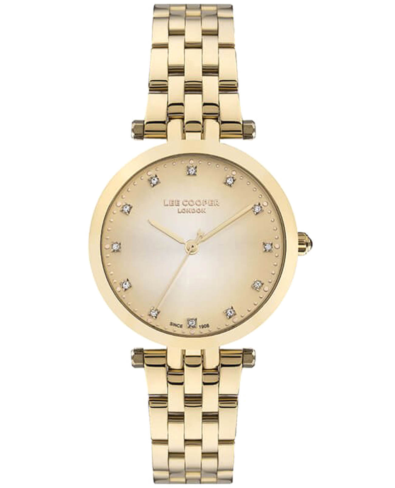 Женские наручные часы Lee Cooper LC07411.110 — это элегантная модель с утончённым дизайном. Корпус диаметром 34 мм выполнен из суперметалла с IP-покрытиемIP-покрытиеМетод ионного напыления. Демонстрирует повышенную устойчивость к истиранию, окислению и химическим веществам. Под воздействием высокого давления и температуры около 1500°C молекулы металла надёжно соединяются с частицами корпуса часов., что придаёт часам изысканный вид. Золотистый циферблат украшен изящными вставками из кристаллов и стрелками, обеспечивая удобное считывание времени. Циферблат защищён минеральным стекломМинеральное стеклоМинеральное стекло представляет собой искусственно выращенный минерал кварца. Такое стекло отличается особой устойчивостью к повреждениям и царапинам. Уступает по некоторым качествам сапфировому стеклу., устойчивым к царапинам. Часы работают на кварцевом механизме, обеспечивая точность хода. Браслет из нержавеющей стали с раскладной застёжкойРаскладная застёжкаТакой тип застёжки используется только на браслетах из металла. Она никогда не раскрывается полностью, происходит разделение на 2 и более частей. Раскладывающая застёжка снизит вероятность потери часов к минимуму. гарантирует комфортное ношение и надёжную фиксацию на запястье. Водозащита 30 метров защищает часы от случайных брызг и дождя, делая их подходящими для повседневного использования.