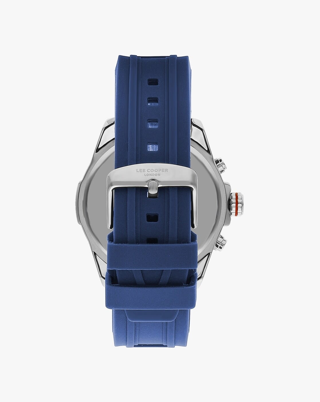 Lee Cooper LC07432.399 — элегантная модель с функциональными возможностями для повседневного использования. Круглый корпус из нержавеющей стали диаметром 48 мм придаёт часам классический и современный вид. Циферблат защищён минеральным стекломМинеральное стеклоМинеральное стекло представляет собой искусственно выращенный минерал кварца. Такое стекло отличается особой устойчивостью к повреждениям и царапинам. Уступает по некоторым качествам сапфировому стеклу., устойчивым к царапинам, хорошо может выдержать небольшие удары и падения. Часы работают на кварцевом механизме, обеспечивающем точность хода. Каучуковый ремешок синего цвета на стандартной застёжке гарантирует удобную посадку и надёжную фиксацию на запястье. Водозащита 50 метров защищает часы от брызг и дождя, делая их подходящими для повседневного использования. Стрелки и метки покрыты люминесцентным покрытиемЛюминесцентное покрытиеПозволяет считывать показания времени в темноте. Производители наносят на стрелки, часовые индексы, безель или поверхность циферблата светонакопительный состав, дающий холодное свечение., обеспечивающим отличную читаемость в темноте.