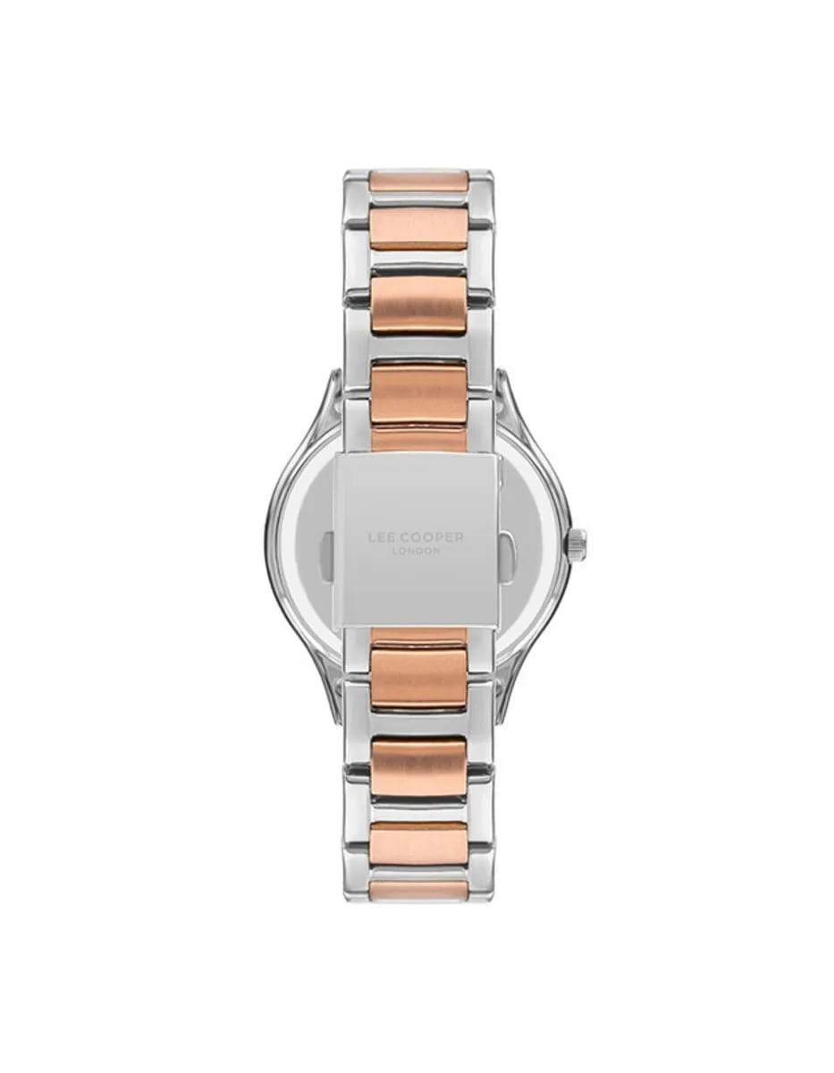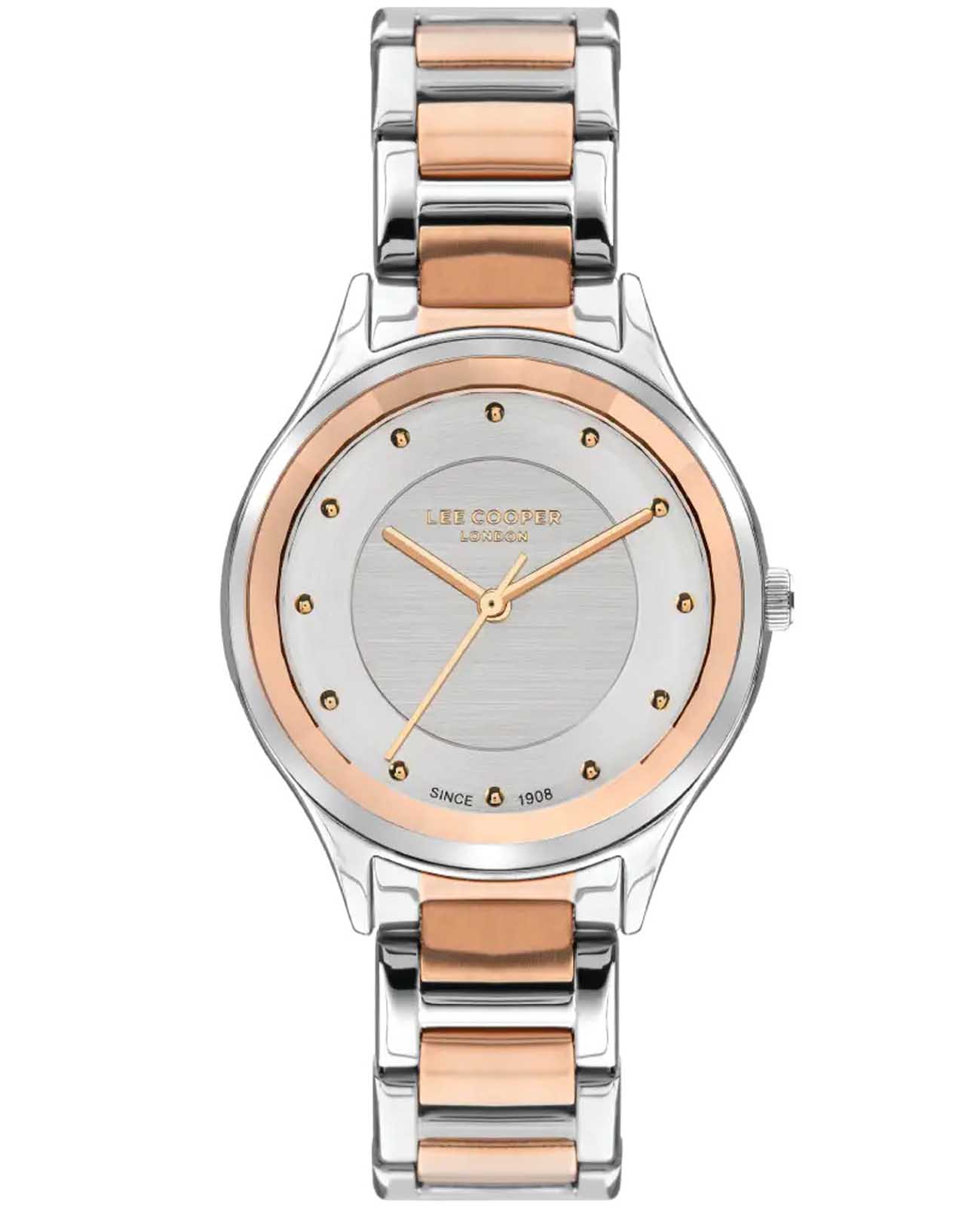 Женские наручные часы Lee Cooper LC07460.530 — это элегантная модель с утончённым дизайном. Корпус диаметром 33,5 мм выполнен из суперметалла, что придаёт часам изысканный вид. Циферблат украшен изящными метками и стрелками, обеспечивая удобное считывание времени. Циферблат защищён минеральным стекломМинеральное стеклоМинеральное стекло представляет собой искусственно выращенный минерал кварца. Такое стекло отличается особой устойчивостью к повреждениям и царапинам. Уступает по некоторым качествам сапфировому стеклу., устойчивым к царапинам. Часы работают на кварцевом механизме, обеспечивая точность хода. Браслет из нержавеющей стали с раскладной застёжкойРаскладная застёжкаТакой тип застёжки используется только на браслетах из металла. Она никогда не раскрывается полностью, происходит разделение на 2 и более частей. Раскладывающая застёжка снизит вероятность потери часов к минимуму. гарантирует комфортное ношение и надёжную фиксацию на запястье. Водозащита 30 метров защищает часы от случайных брызг и дождя, делая их подходящими для повседневного использования. БезельБезельВнешний ободок, закрепляющий стекло. В спортивных часах так называется поворотное кольцо с делениями на циферблате, выполняет роль таймера – замеряет отрезки времени на шкале. Неподвижный безель – элемент декора. Однонаправленно вращающийся безель на дайверских часах позволяет фиксировать моменты погружения и выныривания на поверхность. с частичным IP-покрытиемIP-покрытиеМетод ионного напыления. Демонстрирует повышенную устойчивость к истиранию, окислению и химическим веществам. Под воздействием высокого давления и температуры около 1500°C молекулы металла надёжно соединяются с частицами корпуса часов..