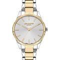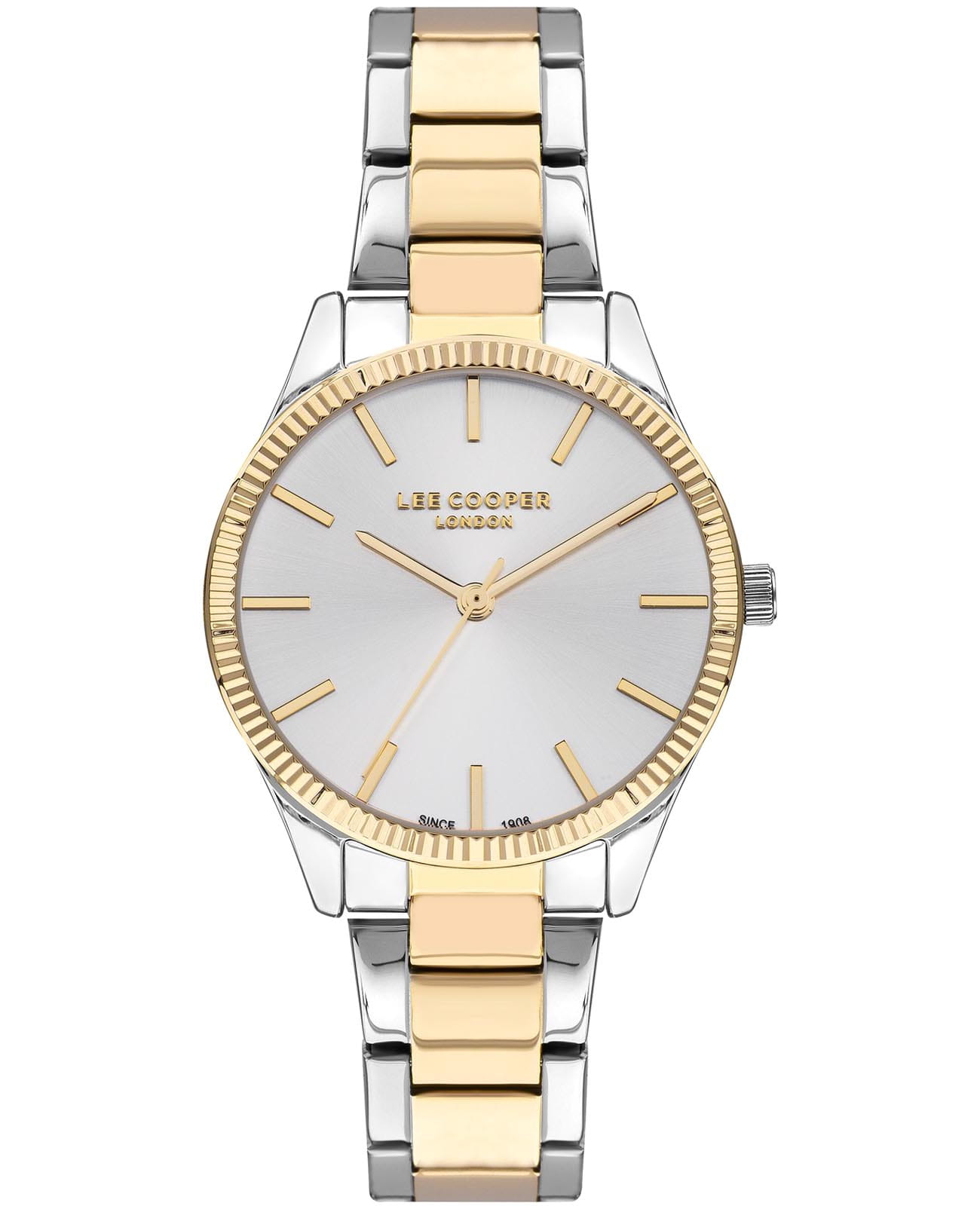 Женские часы Lee Cooper LC07543.230 — это стильное сочетание элегантности и современного дизайна. Круглый корпус диаметром 34 мм выполнен из суперметалла серебристого цвета, что придает модели особый блеск. Циферблат защищен минеральным стекломМинеральное стеклоМинеральное стекло представляет собой искусственно выращенный минерал кварца. Такое стекло отличается особой устойчивостью к повреждениям и царапинам. Уступает по некоторым качествам сапфировому стеклу., обеспечивающим устойчивость к царапинам. Неподвижный рифленый безельБезельВнешний ободок, закрепляющий стекло. В спортивных часах так называется поворотное кольцо с делениями на циферблате, выполняет роль таймера – замеряет отрезки времени на шкале. Неподвижный безель – элемент декора. Однонаправленно вращающийся безель на дайверских часах позволяет фиксировать моменты погружения и выныривания на поверхность. с IP-покрытиемIP-покрытиеМетод ионного напыления. Демонстрирует повышенную устойчивость к истиранию, окислению и химическим веществам. Под воздействием высокого давления и температуры около 1500°C молекулы металла надёжно соединяются с частицами корпуса часов. золотистого цвета. Метки в виде штрихов. Часы оснащены надежным кварцевым механизмом, а металлический браслет с частичным IP-покрытиемIP-покрытиеМетод ионного напыления. Демонстрирует повышенную устойчивость к истиранию, окислению и химическим веществам. Под воздействием высокого давления и температуры около 1500°C молекулы металла надёжно соединяются с частицами корпуса часов. на раскладной застёжкеРаскладная застёжкаТакой тип застёжки используется только на браслетах из металла. Она никогда не раскрывается полностью, происходит разделение на 2 и более частей. Раскладывающая застёжка снизит вероятность потери часов к минимуму. гарантирует комфортную посадку на запястье. Водозащита 30 метров защищает модель от случайных брызг и дождя. Lee Cooper  — отличный выбор для тех, кто ценит утонченность и качество.