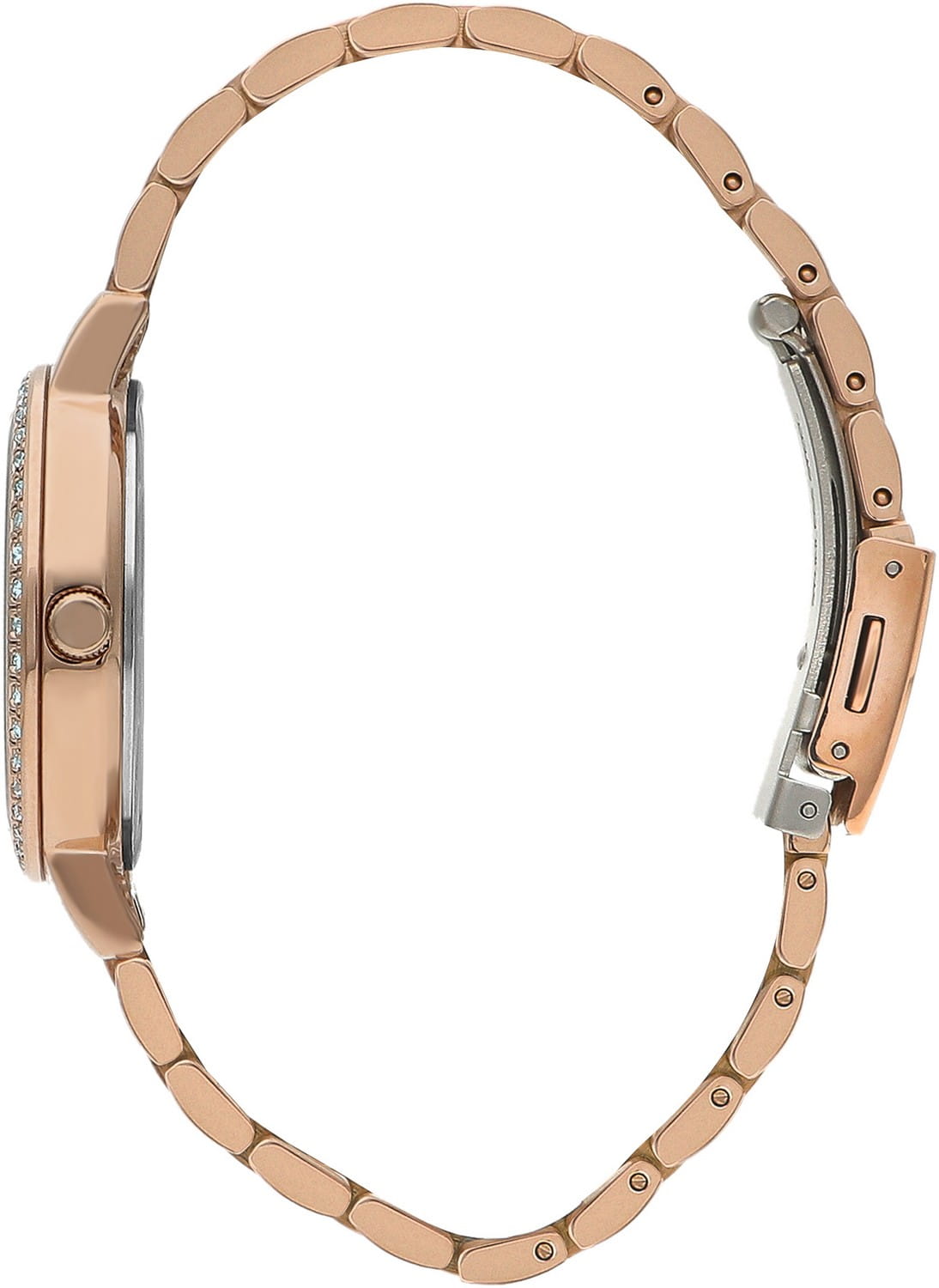 Женские часы Lee Cooper LC07590.410 — это стильное сочетание элегантности и современного дизайна. Круглый корпус диаметром 34 мм выполнен из суперметалла с IP-покрытиемIP-покрытиеМетод ионного напыления. Демонстрирует повышенную устойчивость к истиранию, окислению и химическим веществам. Под воздействием высокого давления и температуры около 1500°C молекулы металла надёжно соединяются с частицами корпуса часов. цвета розового золота. Неподвижный безельБезельВнешний ободок, закрепляющий стекло. В спортивных часах так называется поворотное кольцо с делениями на циферблате, выполняет роль таймера – замеряет отрезки времени на шкале. Неподвижный безель – элемент декора. Однонаправленно вращающийся безель на дайверских часах позволяет фиксировать моменты погружения и выныривания на поверхность. инкрустирован цирконами, что придает модели особый блеск. Циферблат с минималистичными метками в виде точек придает часам элегантность и утонченность, делая их идеальным аксессуаром для любой женщины, а минеральное стеклоМинеральное стеклоМинеральное стекло представляет собой искусственно выращенный минерал кварца. Такое стекло отличается особой устойчивостью к повреждениям и царапинам. Уступает по некоторым качествам сапфировому стеклу., обеспечивает устойчивость к царапинам. Центральные часовая, минутная и секундная стрелки. Часы оснащены надежным кварцевым механизмом, источник питания - батарейка. Металлический браслет с IP-покрытиемIP-покрытиеМетод ионного напыления. Демонстрирует повышенную устойчивость к истиранию, окислению и химическим веществам. Под воздействием высокого давления и температуры около 1500°C молекулы металла надёжно соединяются с частицами корпуса часов. на раскладной застёжкеРаскладная застёжкаТакой тип застёжки используется только на браслетах из металла. Она никогда не раскрывается полностью, происходит разделение на 2 и более частей. Раскладывающая застёжка снизит вероятность потери часов к минимуму. гарантирует комфортную посадку на запястье. Водозащита 30 метров защищает модель от случайных брызг и дождя. Lee Cooper  — отличный выбор для тех, кто ценит утонченность и качество.