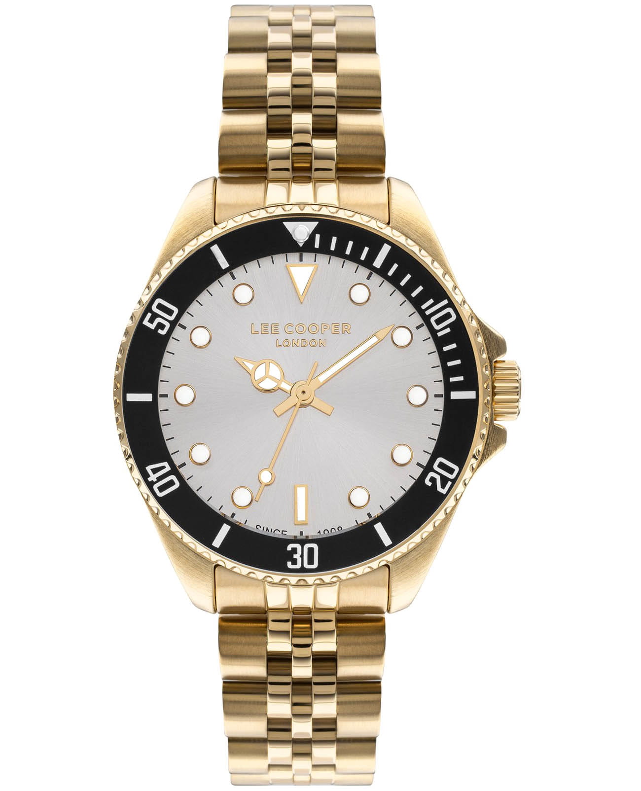 Женские часы Lee Cooper LC07593.130 — это стильное сочетание элегантности и современного дизайна. Круглый корпус диаметром 36 мм выполнен из суперметалла с IP-покрытиемIP-покрытиеМетод ионного напыления. Демонстрирует повышенную устойчивость к истиранию, окислению и химическим веществам. Под воздействием высокого давления и температуры около 1500°C молекулы металла надёжно соединяются с частицами корпуса часов. золотистого цвета. Циферблат защищен минеральным стекломМинеральное стеклоМинеральное стекло представляет собой искусственно выращенный минерал кварца. Такое стекло отличается особой устойчивостью к повреждениям и царапинам. Уступает по некоторым качествам сапфировому стеклу., обеспечивающий устойчивость к царапинам. Поворотный безельБезельВнешний ободок, закрепляющий стекло. В спортивных часах так называется поворотное кольцо с делениями на циферблате, выполняет роль таймера – замеряет отрезки времени на шкале. Неподвижный безель – элемент декора. Однонаправленно вращающийся безель на дайверских часах позволяет фиксировать моменты погружения и выныривания на поверхность. с IP-покрытиемIP-покрытиеМетод ионного напыления. Демонстрирует повышенную устойчивость к истиранию, окислению и химическим веществам. Под воздействием высокого давления и температуры около 1500°C молекулы металла надёжно соединяются с частицами корпуса часов. черного цвета. Центральные часовая, минутная и секундная стрелки. Часы оснащены надежным кварцевым механизмом, источник питания - батарейка. Металлический браслет на раскладной застёжкеРаскладная застёжкаТакой тип застёжки используется только на браслетах из металла. Она никогда не раскрывается полностью, происходит разделение на 2 и более частей. Раскладывающая застёжка снизит вероятность потери часов к минимуму. гарантирует комфортную посадку на запястье. Водозащита 30 метров защищает модель от случайных брызг и дождя. Стрелки с люминесцентным покрытиемЛюминесцентное покрытиеПозволяет считывать показания времени в темноте. Производители наносят на стрелки, часовые индексы, безель или поверхность циферблата светонакопительный состав, дающий холодное свечение. позволяющие легко определять время даже в темноте. Lee Cooper  — отличный выбор для тех, кто ценит утонченность и качество.