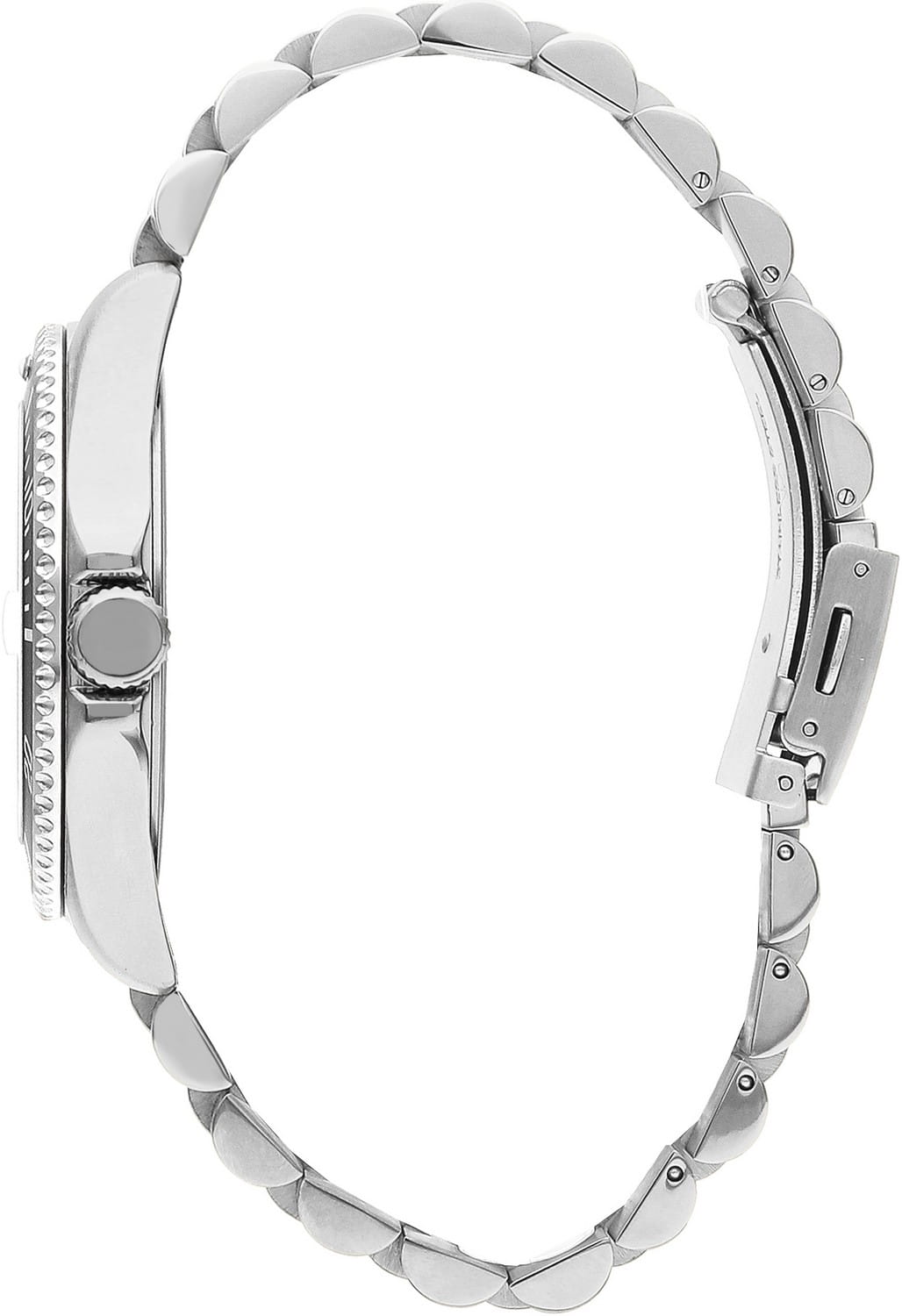 Женские часы Lee Cooper LC07593.350 — это стильное сочетание элегантности и современного дизайна. Круглый корпус диаметром 36 мм выполнен из суперметалла серебристого цвета. Циферблат защищен минеральным стекломМинеральное стеклоМинеральное стекло представляет собой искусственно выращенный минерал кварца. Такое стекло отличается особой устойчивостью к повреждениям и царапинам. Уступает по некоторым качествам сапфировому стеклу., обеспечивающий устойчивость к царапинам. Поворотный безельБезельВнешний ободок, закрепляющий стекло. В спортивных часах так называется поворотное кольцо с делениями на циферблате, выполняет роль таймера – замеряет отрезки времени на шкале. Неподвижный безель – элемент декора. Однонаправленно вращающийся безель на дайверских часах позволяет фиксировать моменты погружения и выныривания на поверхность. с IP-покрытиемIP-покрытиеМетод ионного напыления. Демонстрирует повышенную устойчивость к истиранию, окислению и химическим веществам. Под воздействием высокого давления и температуры около 1500°C молекулы металла надёжно соединяются с частицами корпуса часов. черного цвета. Центральные часовая, минутная и секундная стрелки. Часы оснащены надежным кварцевым механизмом, источник питания - батарейка. Металлический браслет на раскладной застёжкеРаскладная застёжкаТакой тип застёжки используется только на браслетах из металла. Она никогда не раскрывается полностью, происходит разделение на 2 и более частей. Раскладывающая застёжка снизит вероятность потери часов к минимуму. гарантирует комфортную посадку на запястье. Водозащита 30 метров защищает модель от случайных брызг и дождя. Стрелки с люминесцентным покрытиемЛюминесцентное покрытиеПозволяет считывать показания времени в темноте. Производители наносят на стрелки, часовые индексы, безель или поверхность циферблата светонакопительный состав, дающий холодное свечение. позволяющие легко определять время даже в темноте. Lee Cooper  — отличный выбор для тех, кто ценит утонченность и качество.