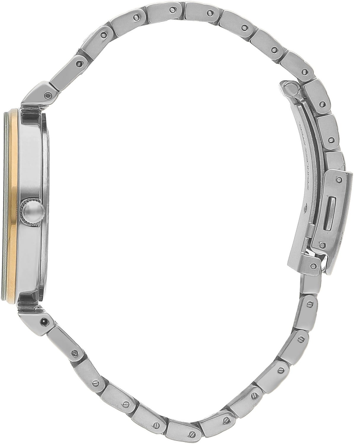 Женские часы Lee Cooper LC07711.230 — это стильное сочетание элегантности и современного дизайна. Круглый корпус диаметром 35 мм выполнен из суперметалла серебристого цвета. Неподвижный безельБезельВнешний ободок, закрепляющий стекло. В спортивных часах так называется поворотное кольцо с делениями на циферблате, выполняет роль таймера – замеряет отрезки времени на шкале. Неподвижный безель – элемент декора. Однонаправленно вращающийся безель на дайверских часах позволяет фиксировать моменты погружения и выныривания на поверхность. с IP-покрытиемIP-покрытиеМетод ионного напыления. Демонстрирует повышенную устойчивость к истиранию, окислению и химическим веществам. Под воздействием высокого давления и температуры около 1500°C молекулы металла надёжно соединяются с частицами корпуса часов. золотого цвета придает модели особый блеск. Изысканный циферблат защищен минеральным стекломМинеральное стеклоМинеральное стекло представляет собой искусственно выращенный минерал кварца. Такое стекло отличается особой устойчивостью к повреждениям и царапинам. Уступает по некоторым качествам сапфировому стеклу., обеспечивающим устойчивость к царапинам. Метки в виде штрихов. Часы оснащены надежным кварцевым механизмом, а стальной браслет с частичным IP-покрытиемIP-покрытиеМетод ионного напыления. Демонстрирует повышенную устойчивость к истиранию, окислению и химическим веществам. Под воздействием высокого давления и температуры около 1500°C молекулы металла надёжно соединяются с частицами корпуса часов. на раскладной застёжкеРаскладная застёжкаТакой тип застёжки используется только на браслетах из металла. Она никогда не раскрывается полностью, происходит разделение на 2 и более частей. Раскладывающая застёжка снизит вероятность потери часов к минимуму. гарантирует комфортную посадку на запястье. Водозащита 30 метров защищает модель от случайных брызг и дождя. Lee Cooper — отличный выбор для тех, кто ценит утонченность и качество.