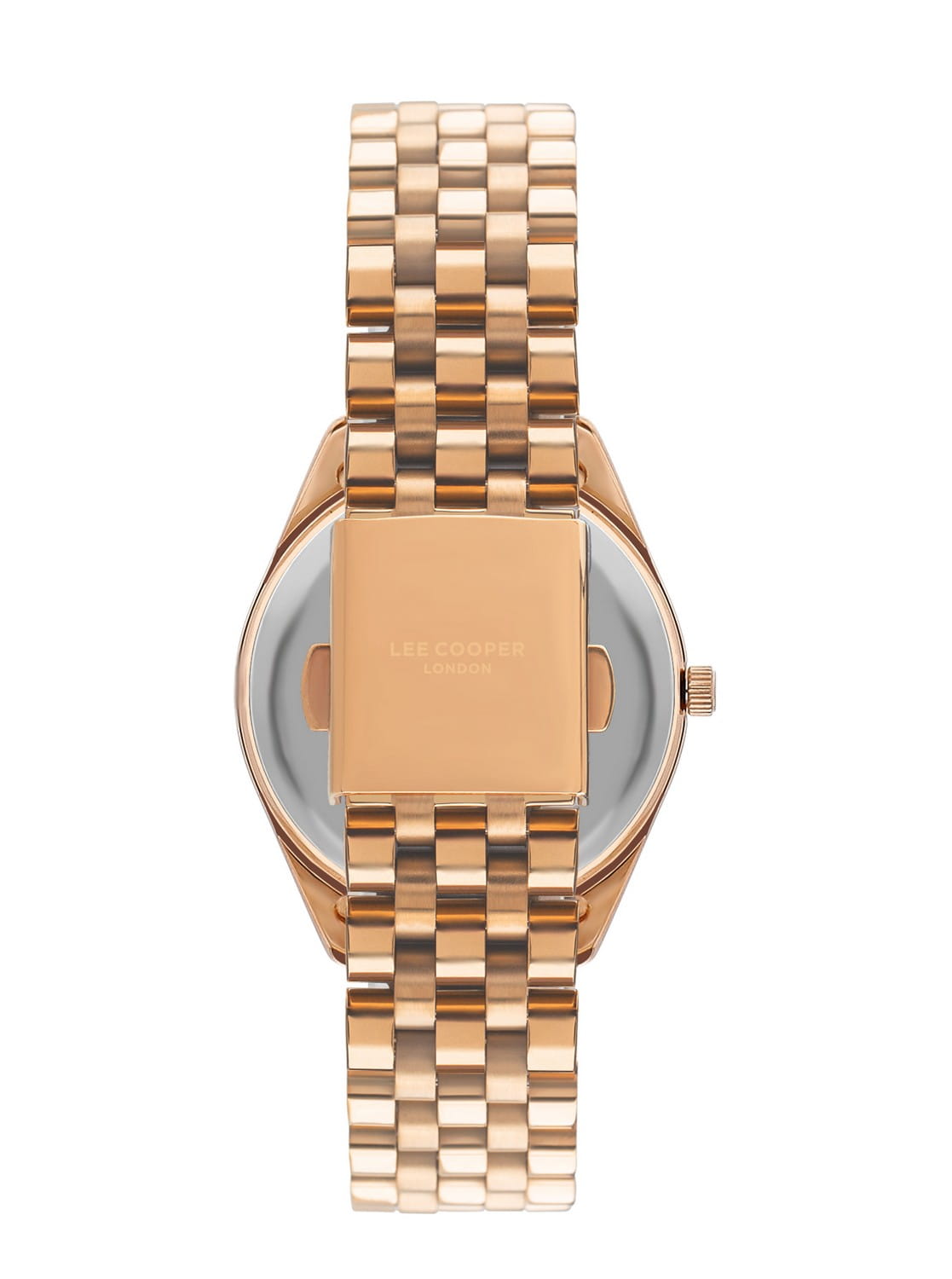 Женские часы Lee Cooper LC07831.490 выполнены в классическом стиле и сочетают строгий дизайн с надёжным механизмом. Модель оснащена кварцевым механизмом, обеспечивающим точность хода и минимальное обслуживание. Корпус круглой формы имеет размер 36 мм, изготовлен из суперметалла с IP-покрытиемIP-покрытиеМетод ионного напыления. Демонстрирует повышенную устойчивость к истиранию, окислению и химическим веществам. Под воздействием высокого давления и температуры около 1500°C молекулы металла надёжно соединяются с частицами корпуса часов. и с изысканным неподвижным безелемБезельВнешний ободок, закрепляющий стекло. В спортивных часах так называется поворотное кольцо с делениями на циферблате, выполняет роль таймера – замеряет отрезки времени на шкале. Неподвижный безель – элемент декора. Однонаправленно вращающийся безель на дайверских часах позволяет фиксировать моменты погружения и выныривания на поверхность. с вставками из циркона, гарантирует комфорт при ношении. Циферблат дополнен изящными вставками из циркона для чёткого отсчёта времени. Защиту циферблата обеспечивает минеральное стеклоМинеральное стеклоМинеральное стекло представляет собой искусственно выращенный минерал кварца. Такое стекло отличается особой устойчивостью к повреждениям и царапинам. Уступает по некоторым качествам сапфировому стеклу., устойчивое к мелким механическим повреждениям. Стрелки с люминесцентным покрытиемЛюминесцентное покрытиеПозволяет считывать показания времени в темноте. Производители наносят на стрелки, часовые индексы, безель или поверхность циферблата светонакопительный состав, дающий холодное свечение.. Стальной браслет с IP-покрытиемIP-покрытиеМетод ионного напыления. Демонстрирует повышенную устойчивость к истиранию, окислению и химическим веществам. Под воздействием высокого давления и температуры около 1500°C молекулы металла надёжно соединяются с частицами корпуса часов. на раскладной застёжкеРаскладная застёжкаТакой тип застёжки используется только на браслетах из металла. Она никогда не раскрывается полностью, происходит разделение на 2 и более частей. Раскладывающая застёжка снизит вероятность потери часов к минимуму. гарантирует удобную посадку и надёжную фиксацию на запястье. Водозащита 30WR позволяет использовать часы в повседневных условиях без риска повреждения от случайных брызг воды. Это сочетание классического дизайна, прочности материалов и качества исполнения для уверенных в себе женщин.