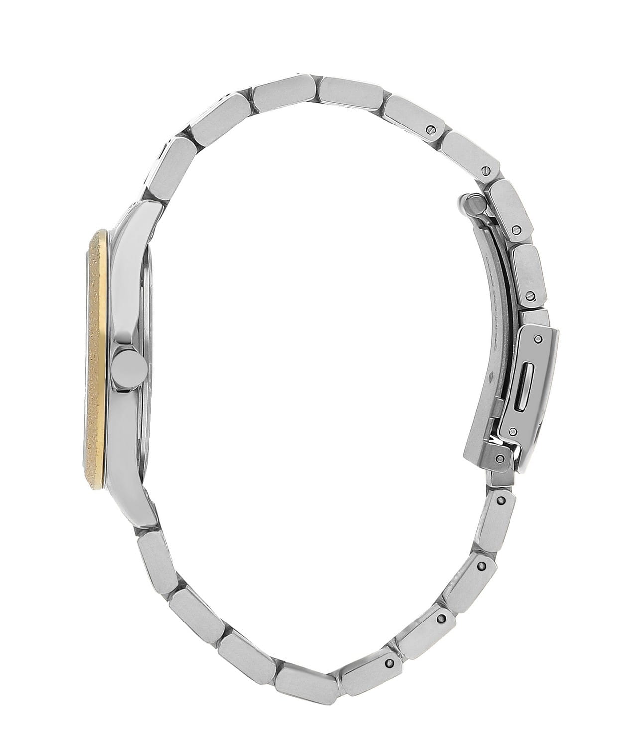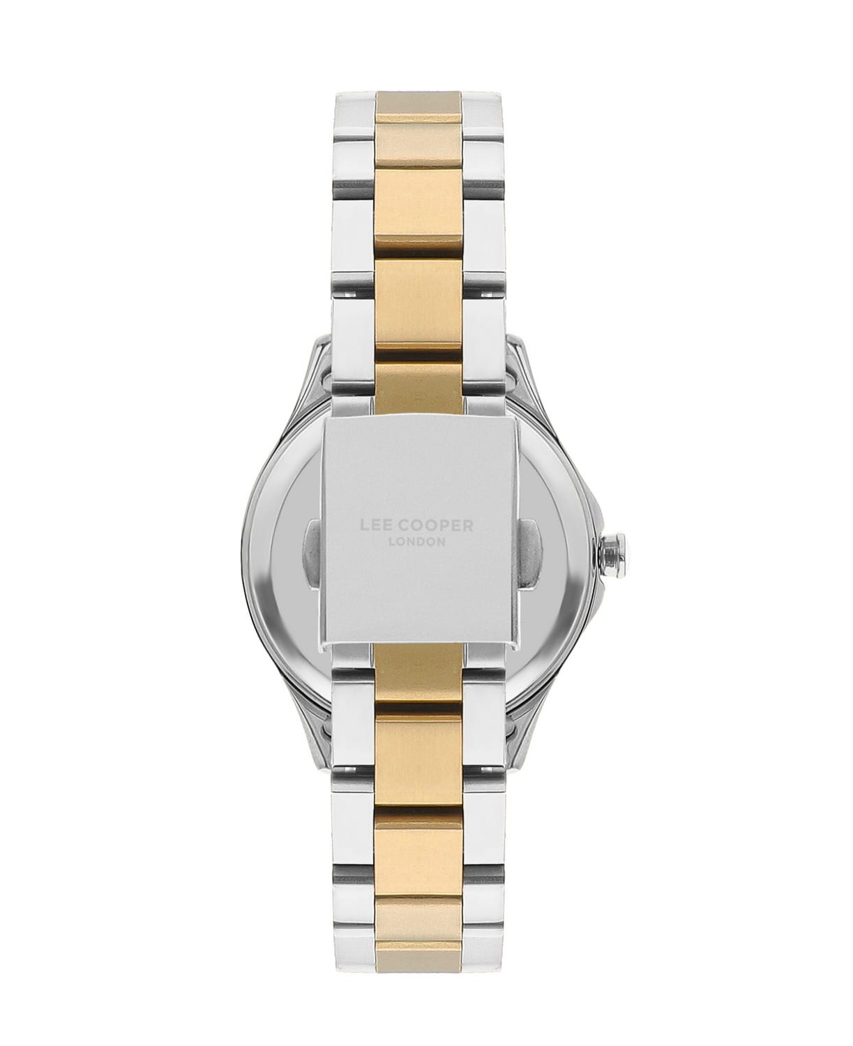 Женские наручные часы Lee Cooper LC07840.220 — это элегантная модель с утончённым дизайном. Корпус диаметром 35 мм выполнен из суперметалла с безелемБезельВнешний ободок, закрепляющий стекло. В спортивных часах так называется поворотное кольцо с делениями на циферблате, выполняет роль таймера – замеряет отрезки времени на шкале. Неподвижный безель – элемент декора. Однонаправленно вращающийся безель на дайверских часах позволяет фиксировать моменты погружения и выныривания на поверхность. с IP-покрытиемIP-покрытиеМетод ионного напыления. Демонстрирует повышенную устойчивость к истиранию, окислению и химическим веществам. Под воздействием высокого давления и температуры около 1500°C молекулы металла надёжно соединяются с частицами корпуса часов., что придаёт часам изысканный вид. Перламутровый циферблат украшен изящными вставками из циркония в виде меток времени и стрелками, обеспечивая удобное считывание времени. Циферблат защищён минеральным стекломМинеральное стеклоМинеральное стекло представляет собой искусственно выращенный минерал кварца. Такое стекло отличается особой устойчивостью к повреждениям и царапинам. Уступает по некоторым качествам сапфировому стеклу., устойчивым к царапинам. Часы работают на кварцевом механизме, обеспечивая точность хода. Часовая и минутная стрелки с люминесцентным покрытиемЛюминесцентное покрытиеПозволяет считывать показания времени в темноте. Производители наносят на стрелки, часовые индексы, безель или поверхность циферблата светонакопительный состав, дающий холодное свечение.. Браслет из нержавеющей стали с частичным IP-покрытиемIP-покрытиеМетод ионного напыления. Демонстрирует повышенную устойчивость к истиранию, окислению и химическим веществам. Под воздействием высокого давления и температуры около 1500°C молекулы металла надёжно соединяются с частицами корпуса часов. с раскладной застёжкойРаскладная застёжкаТакой тип застёжки используется только на браслетах из металла. Она никогда не раскрывается полностью, происходит разделение на 2 и более частей. Раскладывающая застёжка снизит вероятность потери часов к минимуму. гарантирует комфортное ношение и надёжную фиксацию на запястье. Водозащита 30 метров защищает часы от случайных брызг и дождя, делая их подходящими для повседневного использования.