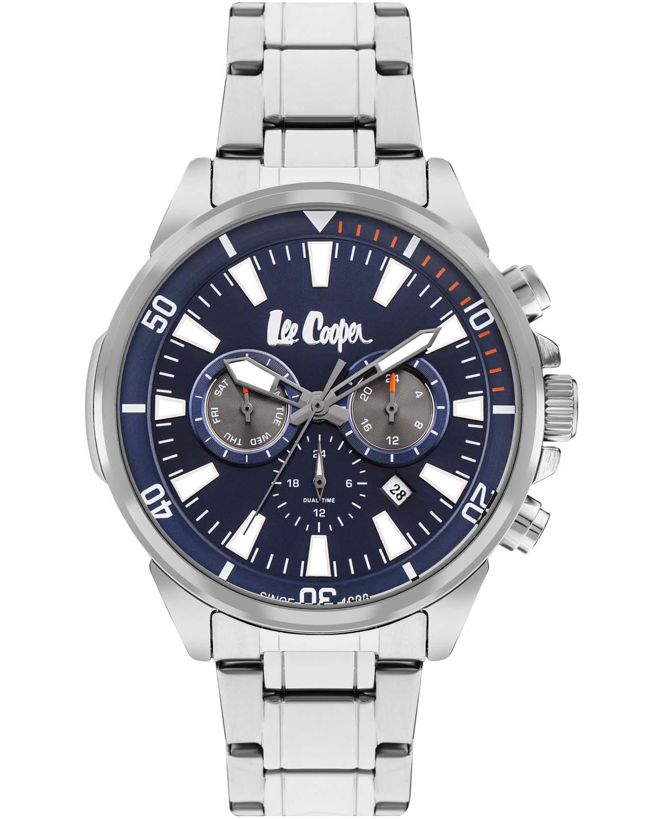 Мужские наручные часы Lee Cooper LC07846.390 оснащены кварцевым механизмом, обеспечивающий высокую точность хода и надежность. Элегантный корпус часов выполнен из суперметалла серебристого цвета, что делает их устойчивыми к внешним воздействиям и придает благородный вид. Циферблат украшен стрелками и метками с люминесцентным покрытиемЛюминесцентное покрытиеПозволяет считывать показания времени в темноте. Производители наносят на стрелки, часовые индексы, безель или поверхность циферблата светонакопительный состав, дающий холодное свечение., гармонично дополняющим общий дизайн модели. Для защиты циферблата используется минеральное стеклоМинеральное стеклоМинеральное стекло представляет собой искусственно выращенный минерал кварца. Такое стекло отличается особой устойчивостью к повреждениям и царапинам. Уступает по некоторым качествам сапфировому стеклу., устойчивое к царапинам и механическим повреждениям. Корпус имеет круглую форму диаметром 46 мм, что делает часы заметными и подходящими. Браслет из стали оснащен раскладной застёжкойРаскладная застёжкаТакой тип застёжки используется только на браслетах из металла. Она никогда не раскрывается полностью, происходит разделение на 2 и более частей. Раскладывающая застёжка снизит вероятность потери часов к минимуму., обеспечивающим комфортное и безопасное ношение. Вынесенный циферблат с 24-х часовым указателем времени, дня недели и вторым часовым поясомВторой часовой поясФункция, позволяющая отображать время двух часовых поясов одновременно.. Окошко даты находится в положении между 4 и 5 часов. Часы обладают водонепроницаемостью до 50 метров (5 АТМ), что позволяет использовать их в повседневной жизни, включая контакт с водой при мытье рук или дожде. Эти часы станут идеальным выбором для мужчин, ценящих стиль, качество и функциональность.