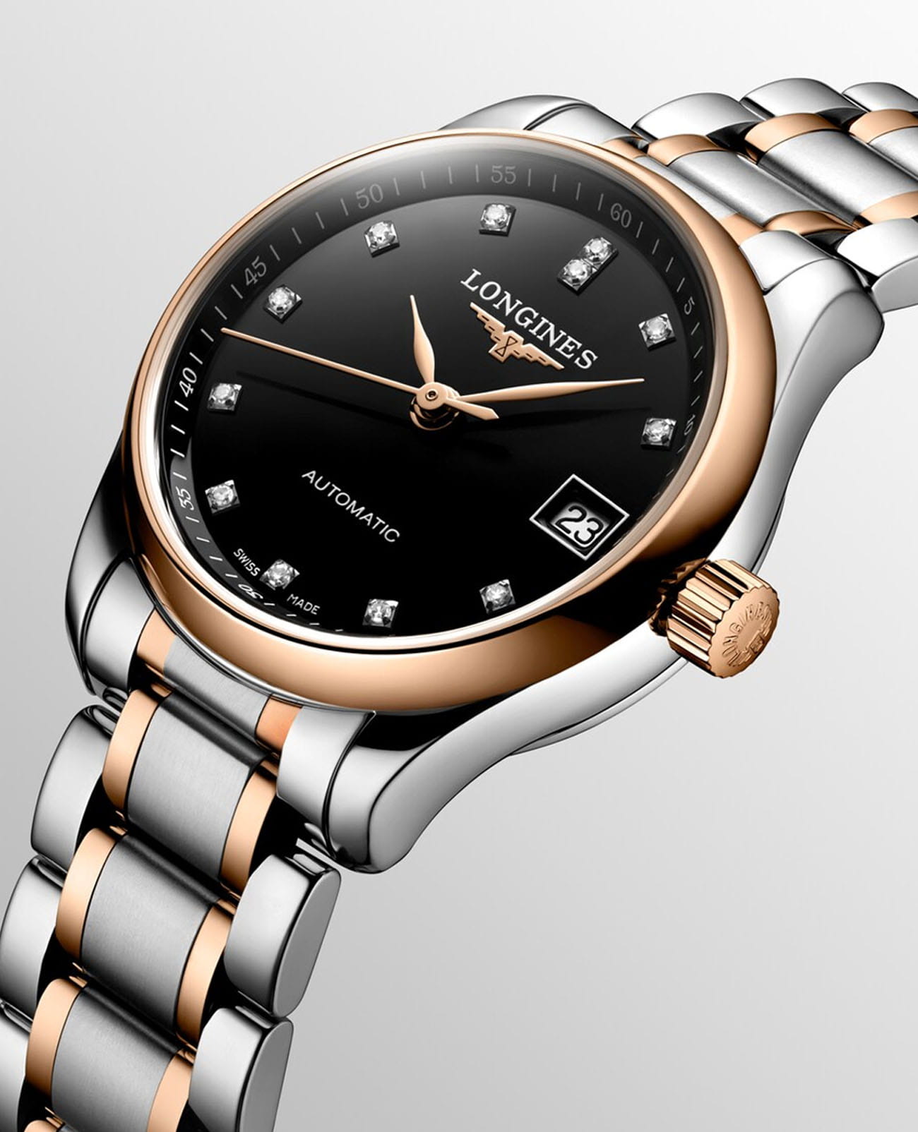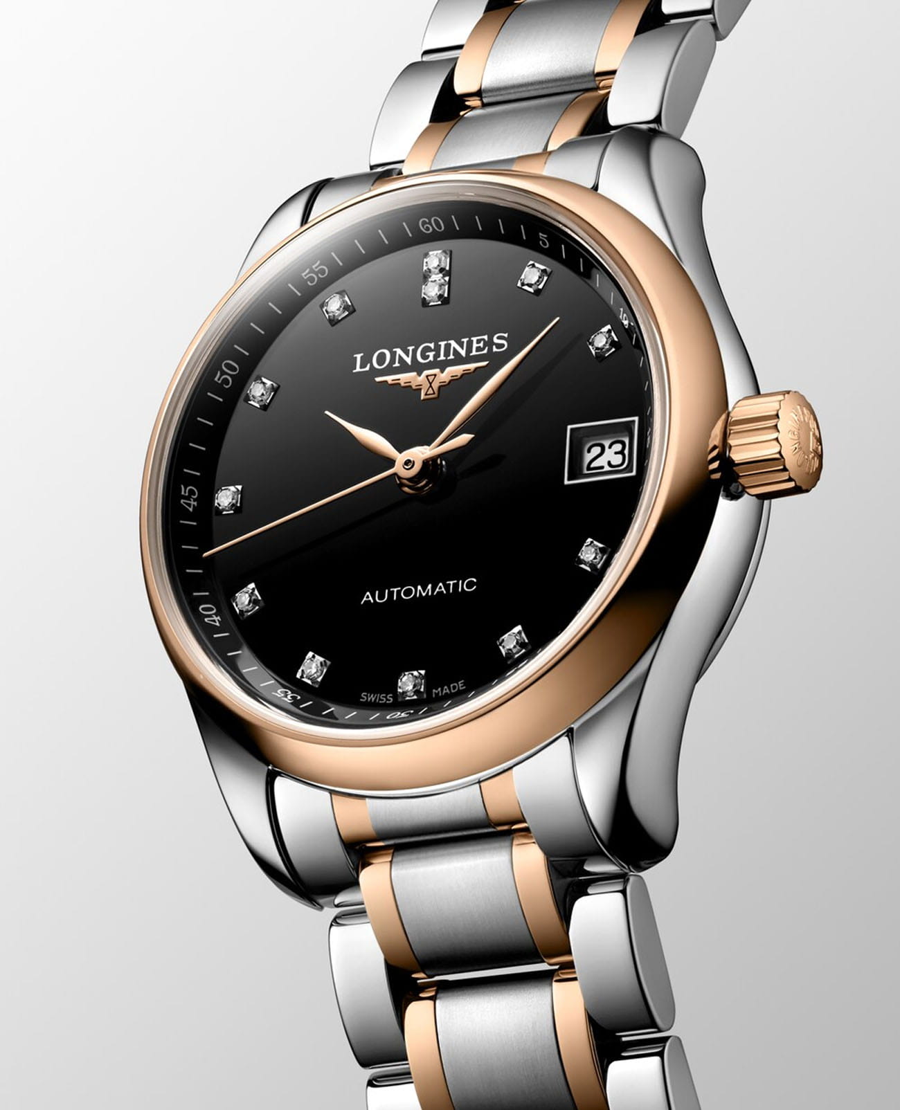 Женские швейцарские механические часы с автоподзаводом Longines Master Collection L2.128.5.59.7. Сапфировое стеклоСапфировое стеклоПрочный и надёжный материал из кристалла сапфира синтетического происхождения, характеризующийся особой твёрдостью и устойчивостью к царапинам и повреждениям. устойчивое к появлению царапин, обладающее высокой прозрачностью. Корпус часов изготовлен из нержавеющей стали. БезельБезельВнешний ободок, закрепляющий стекло. В спортивных часах так называется поворотное кольцо с делениями на циферблате, выполняет роль таймера – замеряет отрезки времени на шкале. Неподвижный безель – элемент декора. Однонаправленно вращающийся безель на дайверских часах позволяет фиксировать моменты погружения и выныривания на поверхность. с 18-каратным золотом18-каратное золотоОбозначение по каратной системе пробирования, оно показывает, сколько драгоценного металла содержится в изделии. 18 карат - в составе 75% чистого золота, соответствует 750 пробе.