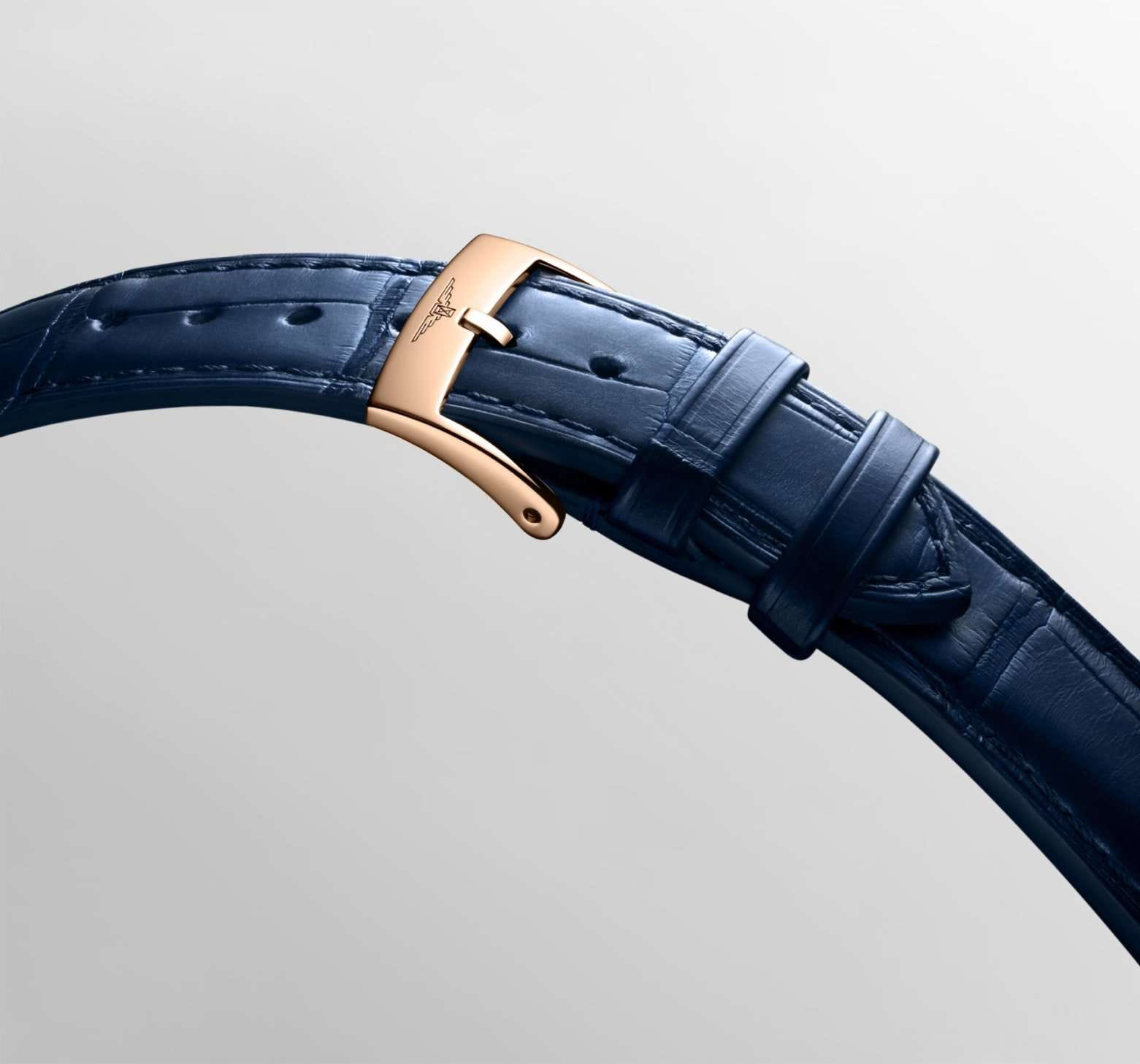 Ремешок выполнен из кожи аллигатора и дополнен застёжкой, изготовленной из розового золота, соответствующего корпусу. Водозащита до 3 ATM делает модель подходящей для повседневной носки при аккуратном использовании.