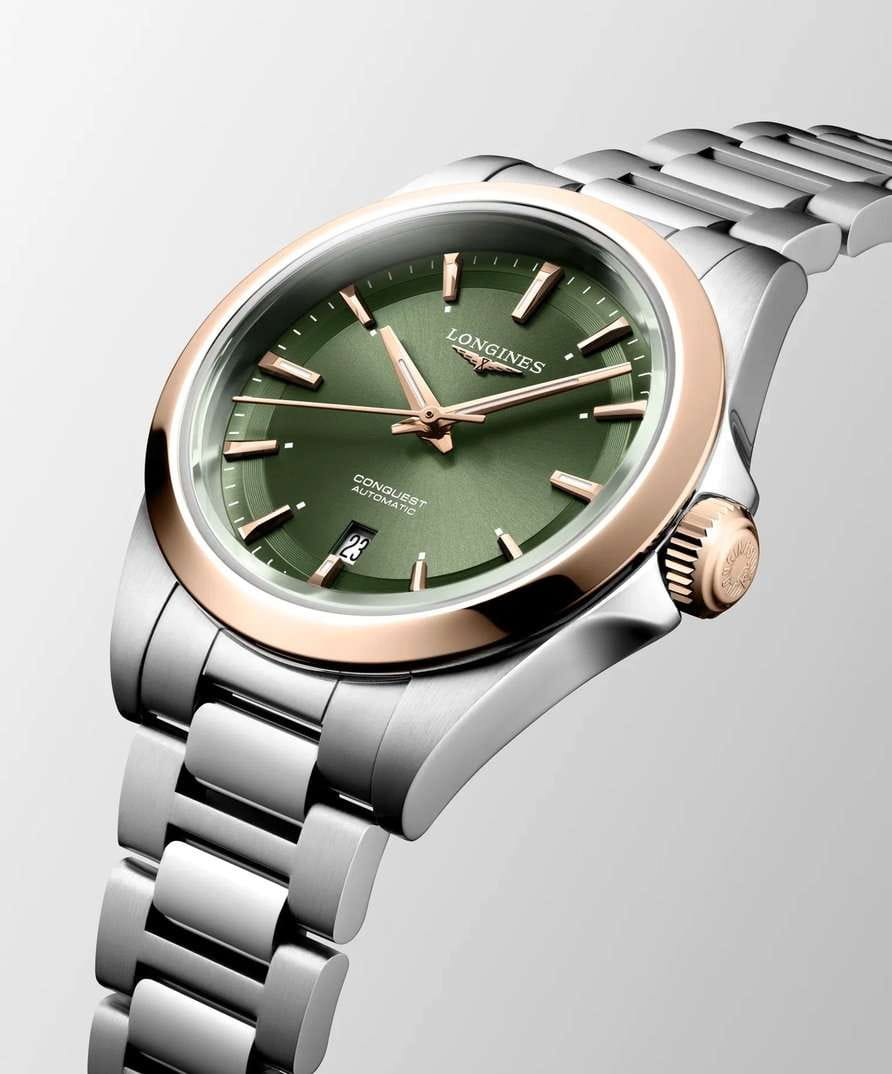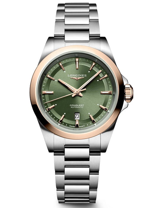 Longines Conquest L3.320.5.02.6 — женственные и выразительные часы, в которых строгость современной классики сочетается с благородной двухтональной отделкой. Корпус диаметром 30 мм изготовлен из нержавеющей стали и дополнен изящным безелем из 18-каратного розового золота, создающим тёплый контраст и подчёркивающим премиальный характер модели.