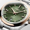 Циферблат тёмно-зелёного оттенка с сатинированной отделкой «солнечные лучи» играет глубиной и переливами при любом освещении. Метки и стрелки выполнены в тон к безелю и покрыты составом Swiss Super-LumiNova®, обеспечивающим читаемость даже в условиях слабой освещённости. В положении «6 часа» находится аккуратное окошко даты. Поверхность циферблата защищает изогнутое сапфировое стеклоСапфировое стеклоПрочный и надёжный материал из кристалла сапфира синтетического происхождения, характеризующийся особой твёрдостью и устойчивостью к царапинам и повреждениям. с антибликовым покрытием.